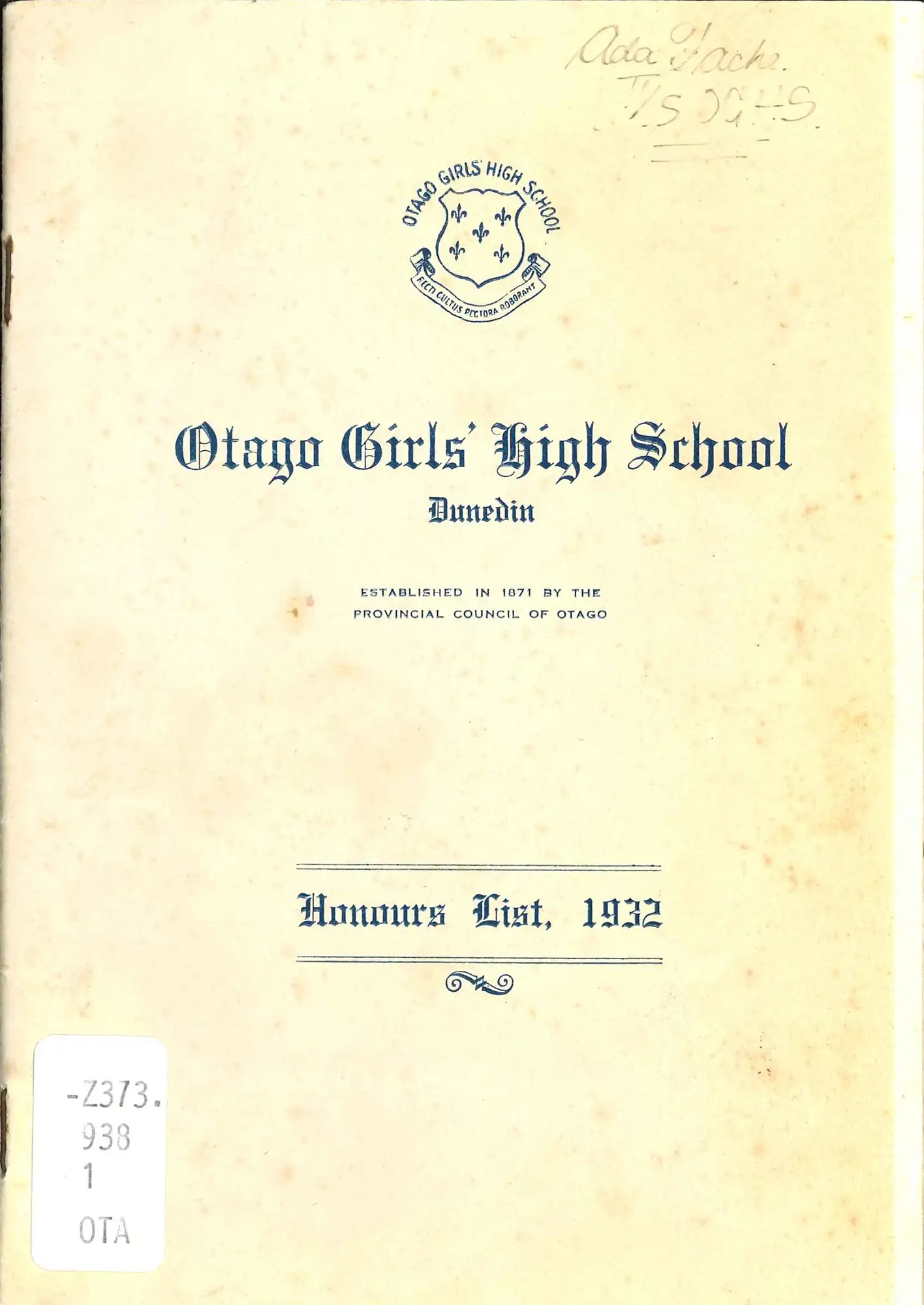 Otago Girls’ High School, Dunedin: Honours List, 1932. Otago Girls’ High School, Dunedin: Honours List, 1932. Open image in new window