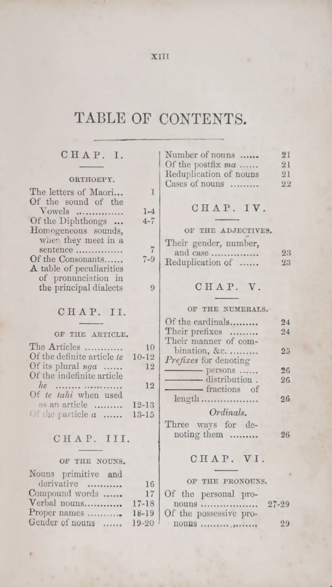 Maunsell's grammar was first written in 1841-42 and issued in four parts, the first three in 1842 and part four in 1843. This 2nd edition is substantially the same, but issued as one volume. It is shown open at the contents page to give an idea of the layout of the work.