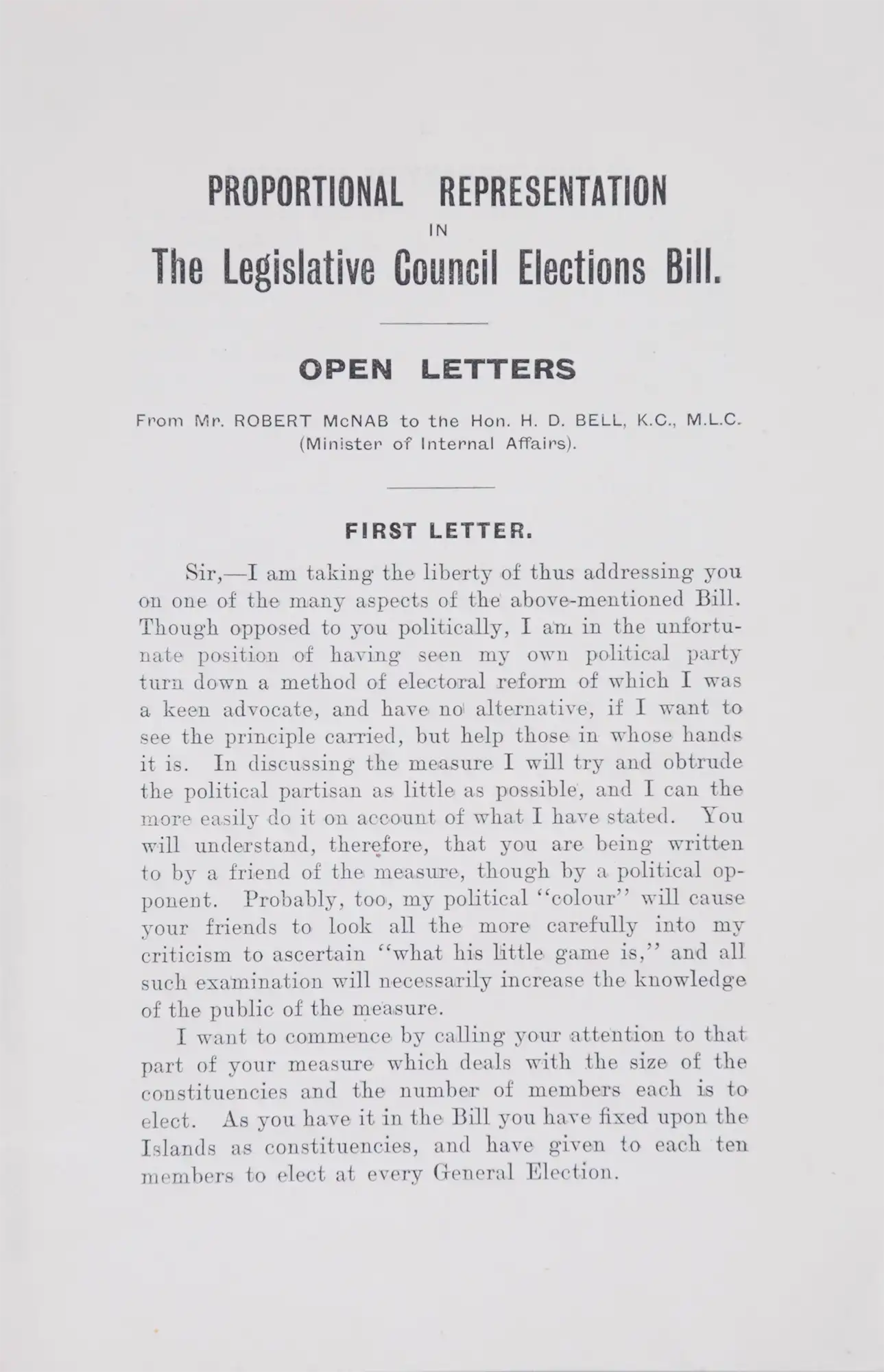 Alternatives to first-past-the-post voting were widely discussed in the late-19th and early 20th centuries, long before the advent of MMP in 1996. Robert McNab was a keen advocate of proportional representation as he believed it wrong that successful candidates in the first-past-the-post system often won with a minority of the total votes. McNab submitted the Absolute Majority Bill to the House in 1896 which allowed for a system of preferential voting in general electorates but his bill was eventually unsuccessful. A modification of the idea in the form of the second ballot or two-round election was used in the 1908 and 1911 elections. McNab sets forth his views in this pamphlet in dialogue with H. D. Bell (Francis Henry Dillon Bell) the leader of the Legislative Council who had proposed that members of the upper house be elected by a proportional system instead of being appointed.