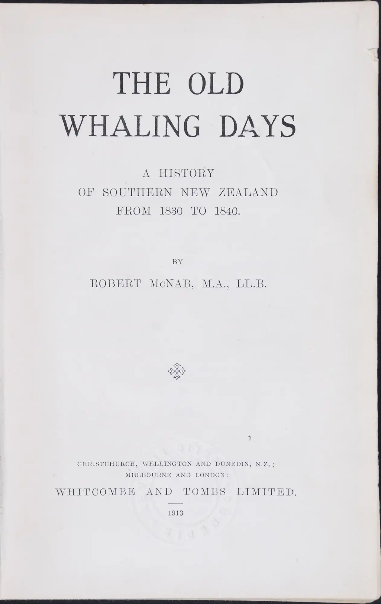 Robert McNab. The Old Whaling Days: a history of Southern New Zealand from 1830 to 1840. Christchurch: Whitcombe and Tombs Limited, 1913.