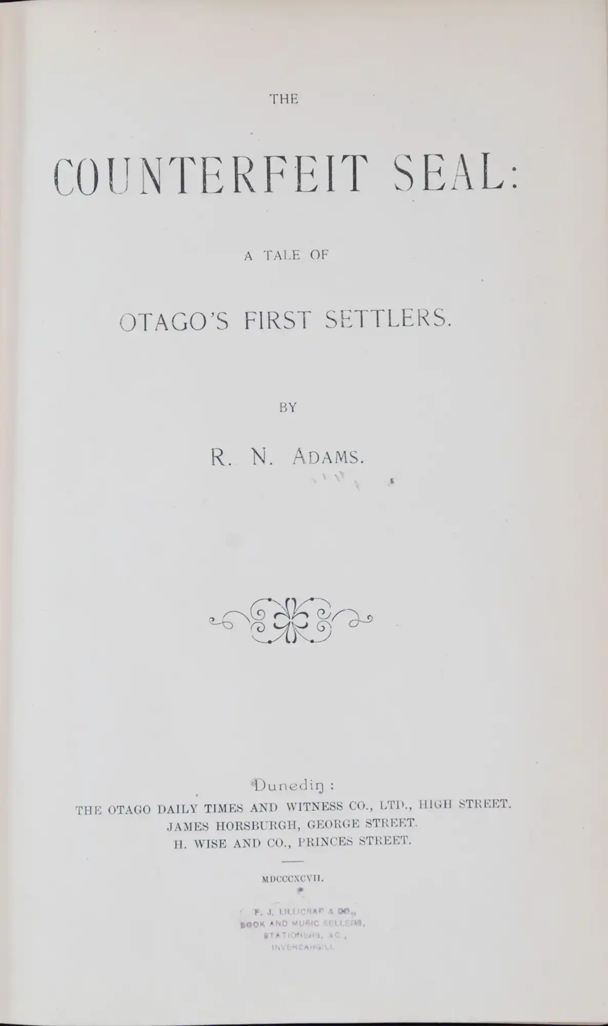 Robert Noble Adams. The Counterfeit Seal: a tale of Otago's first settlers. Dunedin: Otago Daily Times and Witness Co., 1897.