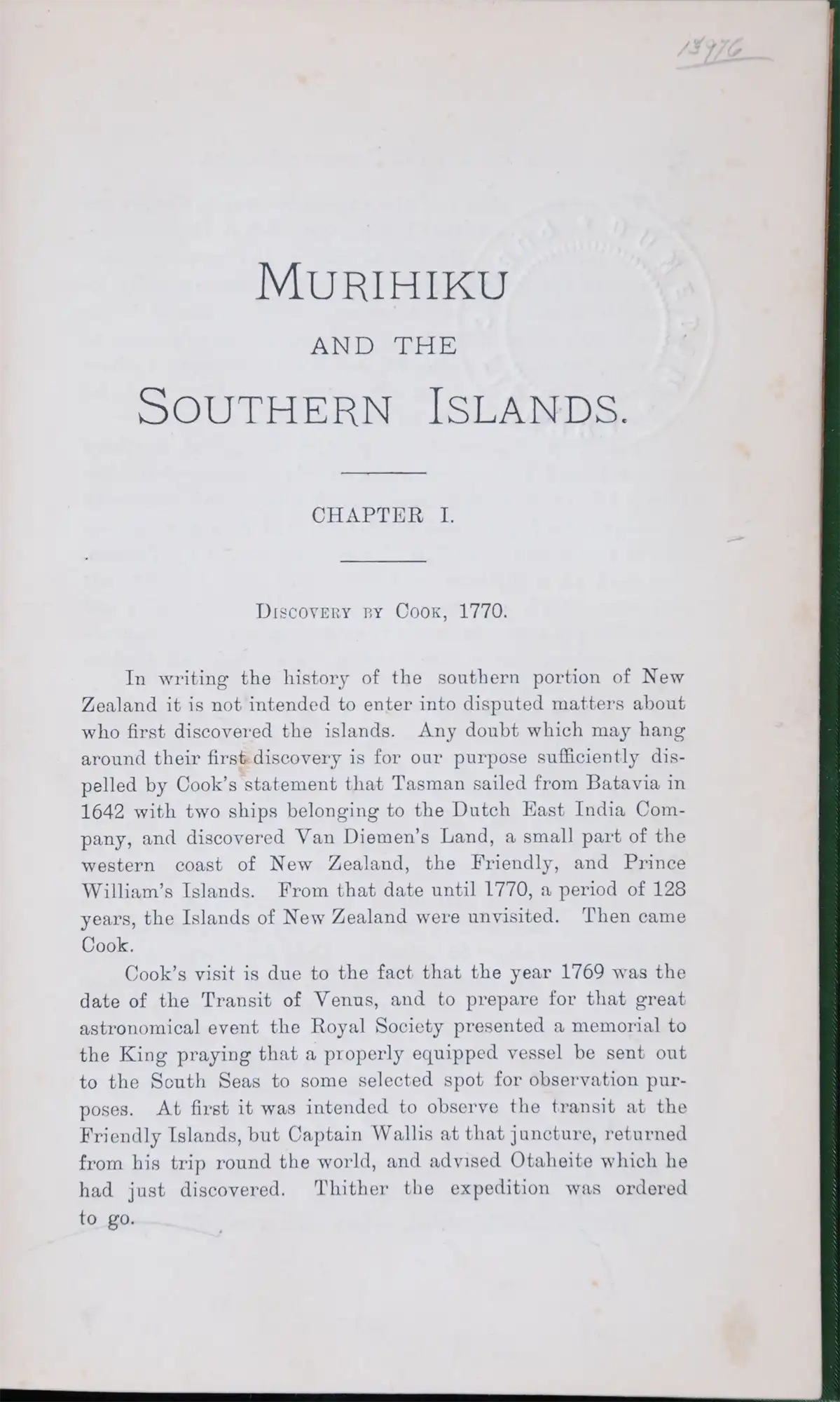 The first portion of an edition of 600 copies of Murihiku was printed in 1906, before Robert took the opportunity to fulfil a long-desired visit to the old whaling ports of America's Atlantic states. His research in America resulted in the discovery of a large quantity of new material relating to southern New Zealand. Thus, upon his return, the whole edition was destroyed and rewritten - apart from six copies, of which this is one.