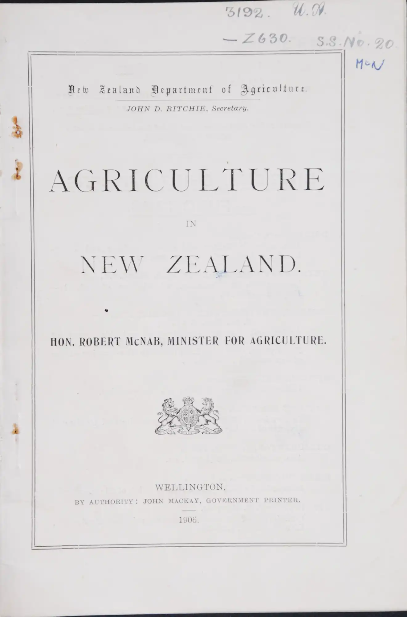 Robert McNab. Agriculture in New Zealand. Wellington: Government Printer, 1906.