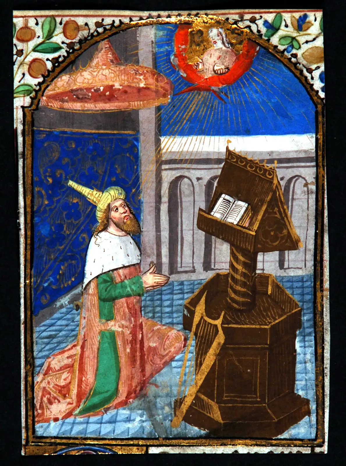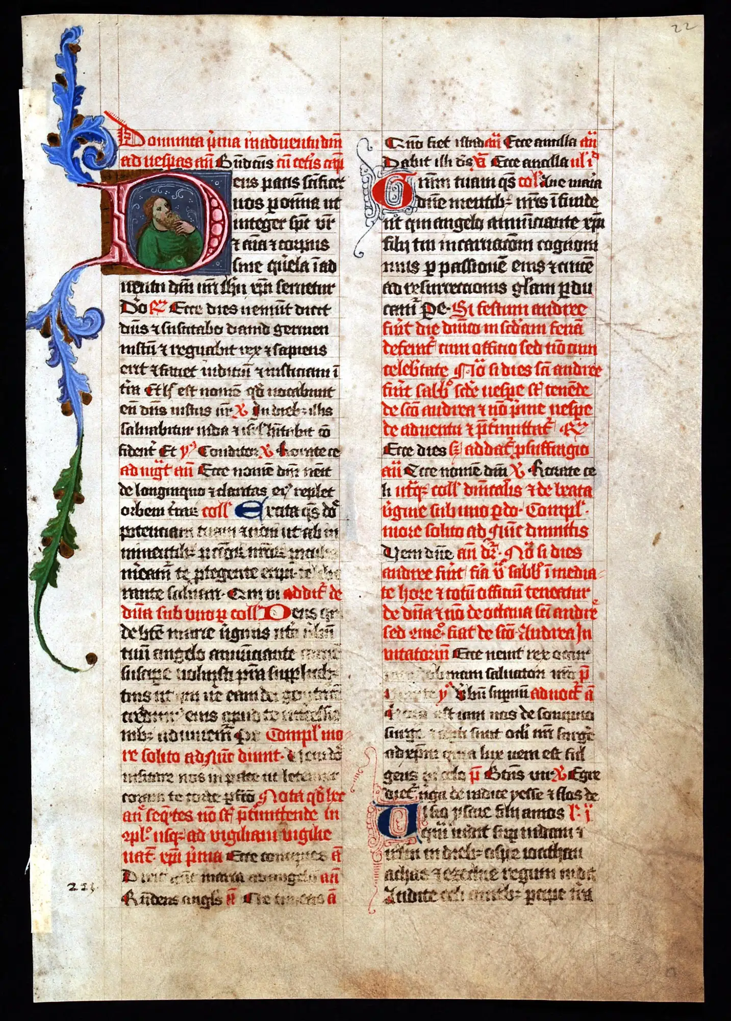 This leaf contains a five-line illuminated initial painted in pink on a burnished gold and grey ground, infilled with a half-length figure dressed in a green tunic and stroking his thick beard; with partial borders of blue and green acanthus foliage extending into the margin.