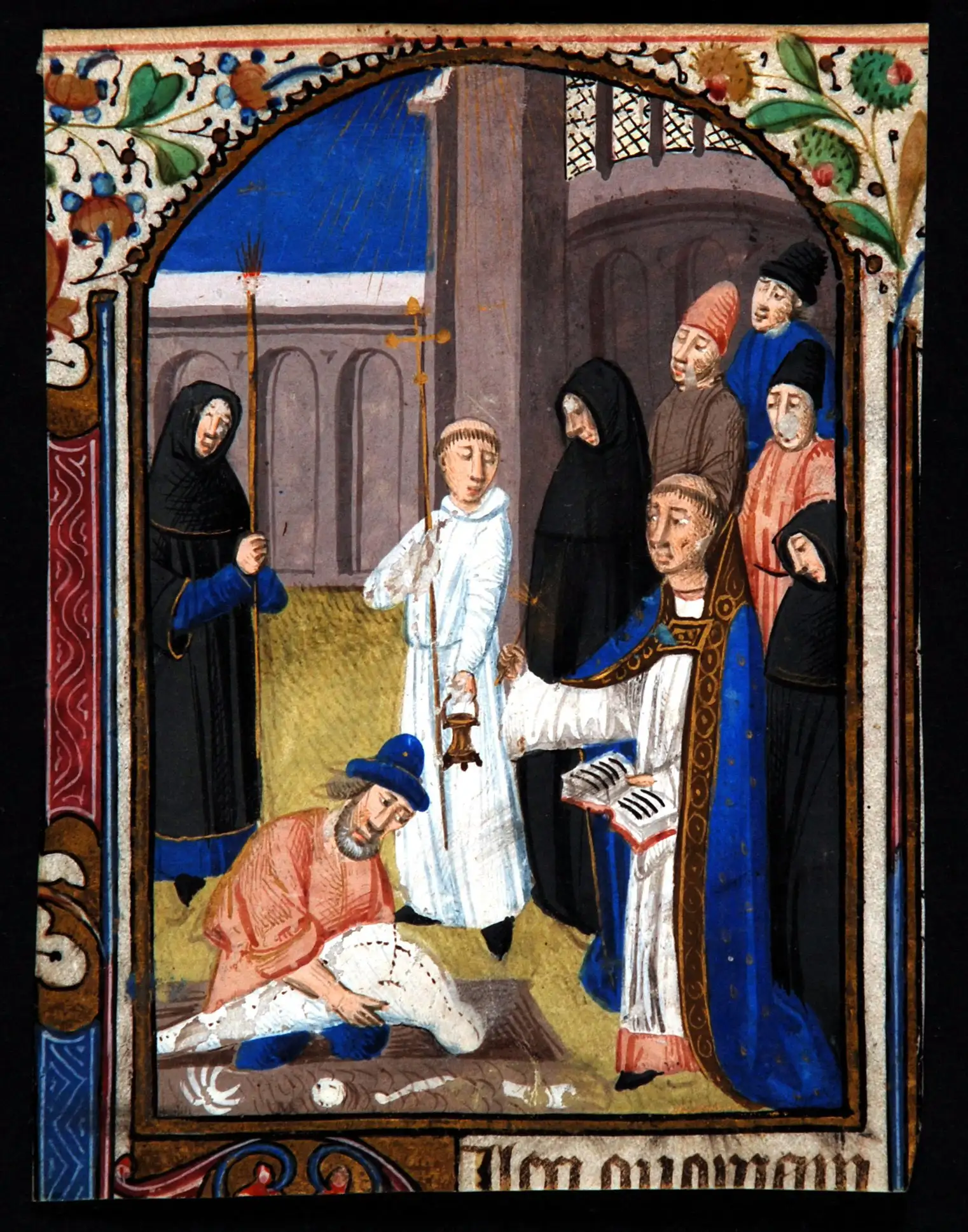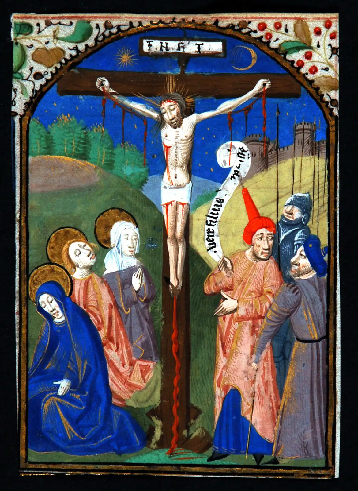 The miniatures preceded the openings of the penitential psalms, the Hours of the Cross, and the Office of the Dead respectively.