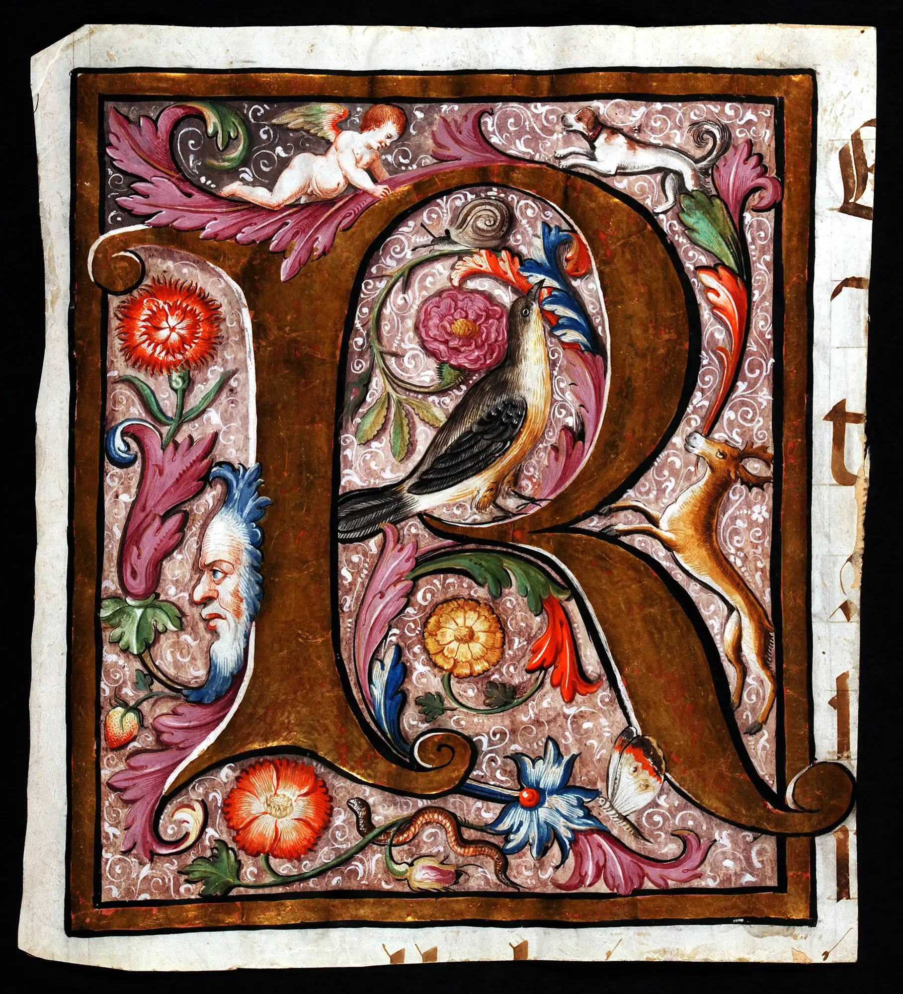 The very large initial ‘R’ in heavily raised burnished gold is infilled and surrounded by flowers, fruit, foliage, a cherub, a hound, a deer, a snail, a butterfly, a bird, a snake, and the profile of a bearded Green Man. The style is northern Renaissance, either Netherlandish or Spanish in the Netherlandish style.