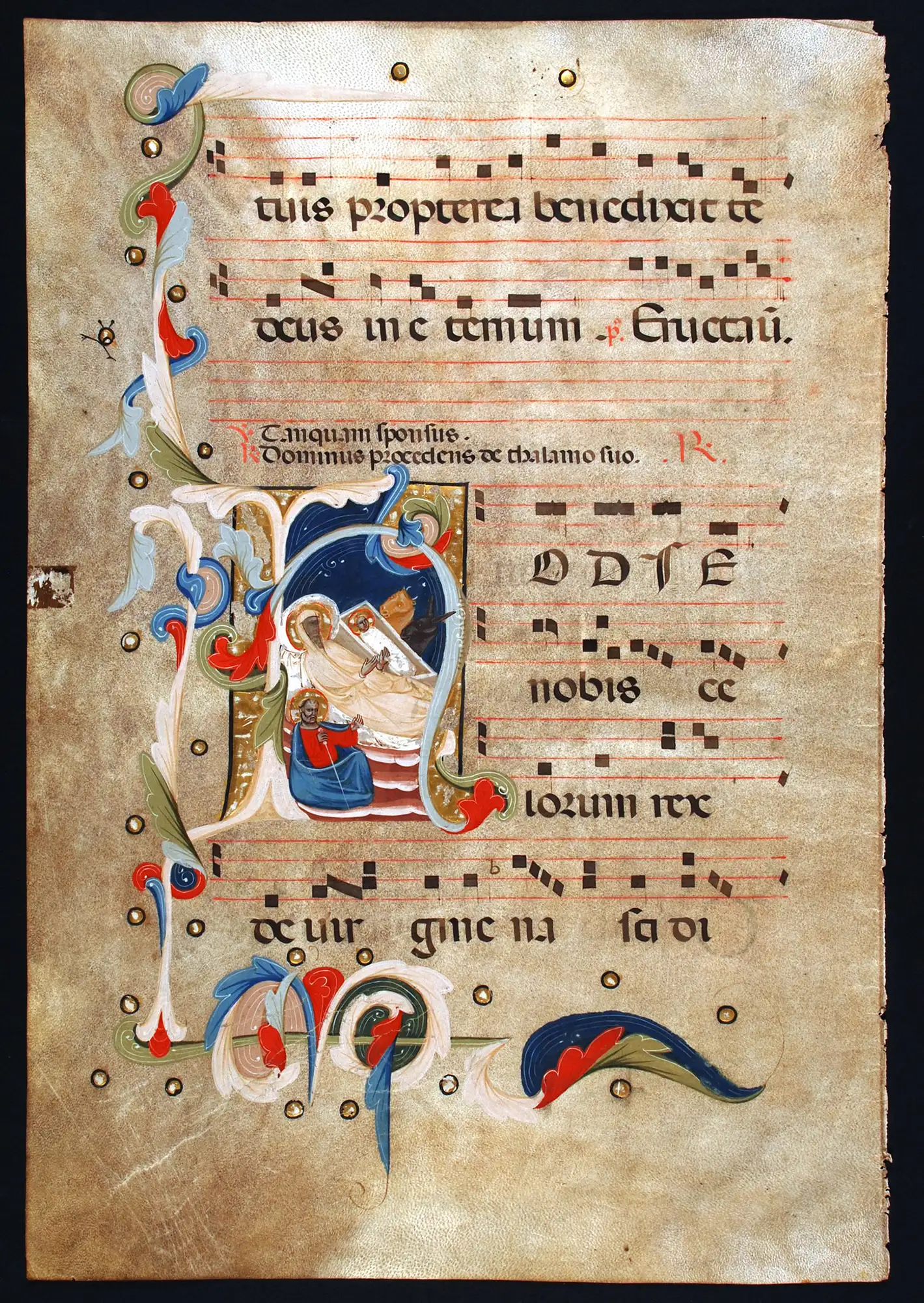 This leaf is from an Antiphonal which was probably part of a series of choir books commissioned in Northern Italy in the early fourteenth century.