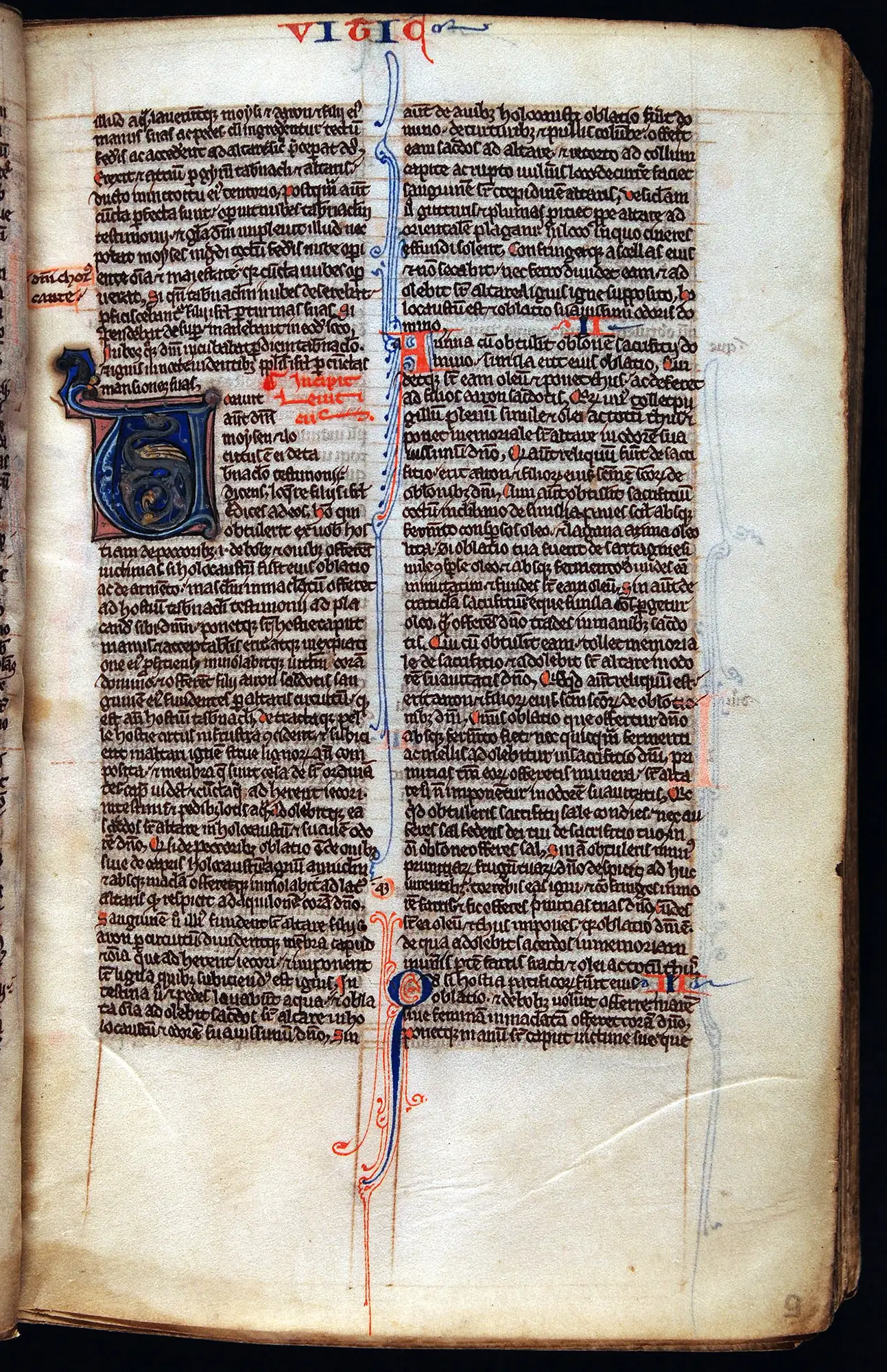 This late thirteenth century Vulgate Bible is written in a very small Gothic bookhand. Decorated initials of five to eight lines introduce the biblical books. The initials incorporate floral designs, as well as human, animal, bird and grotesque figures. The manuscript is open at Exodus 40:29 to Leviticus 3:2.