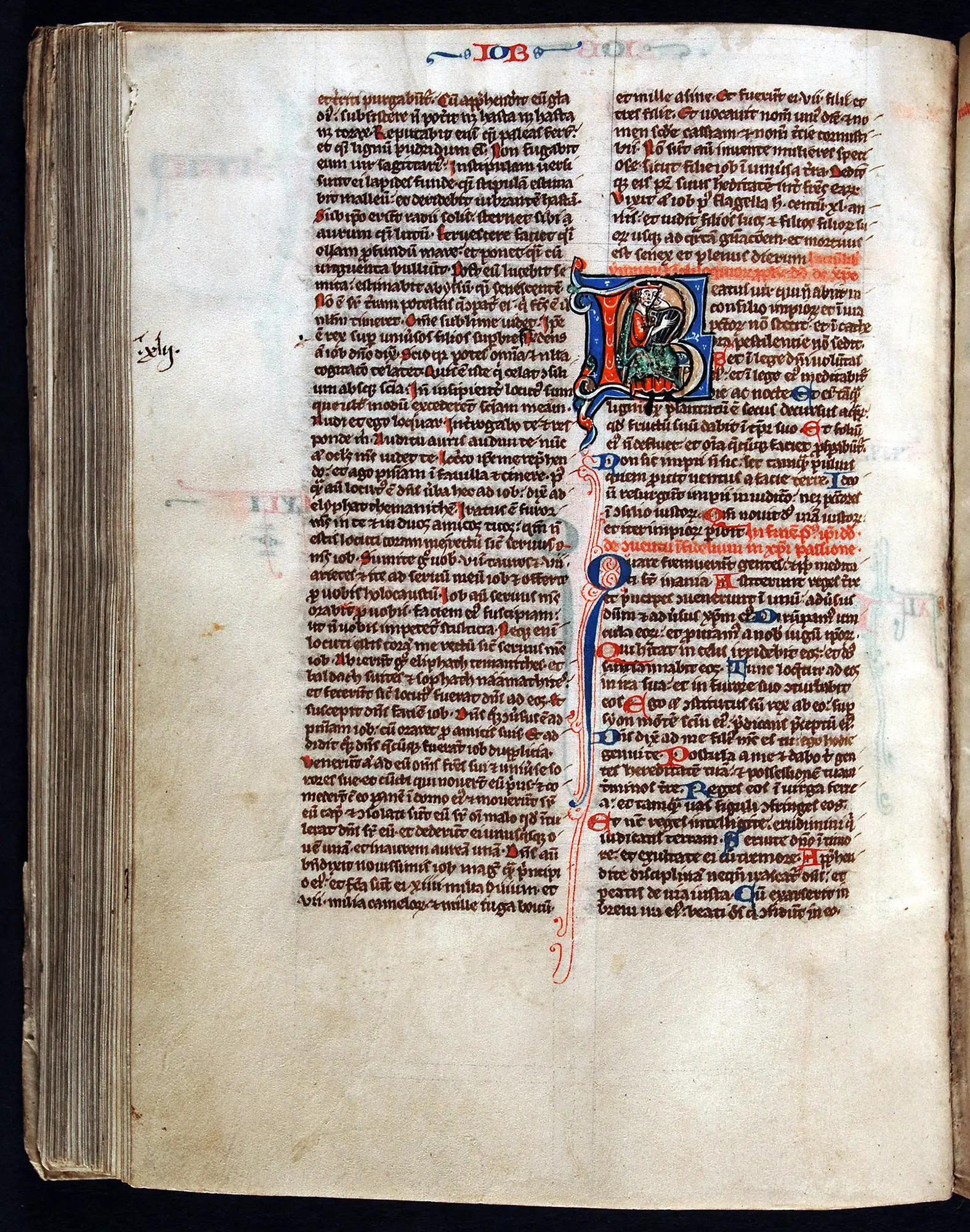 This manuscript is open at Job 41:17-Psalms 7:12, with a historiated initial ‘B’ depicting King David (often attributed as author of the Psalms) playing a lyre. Six-to-seven-line decorated initials introduce the biblical books, and two-line red and blue chapter initials appear throughout this thirteenth century Bible.