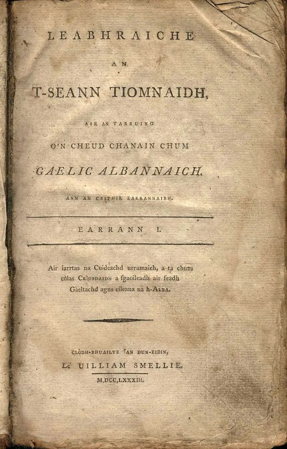 [Old Testament in Scottish Gaelic]. Leabhraiche an t-Seann Tiomnaidh: air an tarruing o'n cheud chanain chum Gaelic Albannaich … Clodh-bhuailte 'an Dun-Eidin [Edinburgh]: Le Uilliam Smellie, 1783.