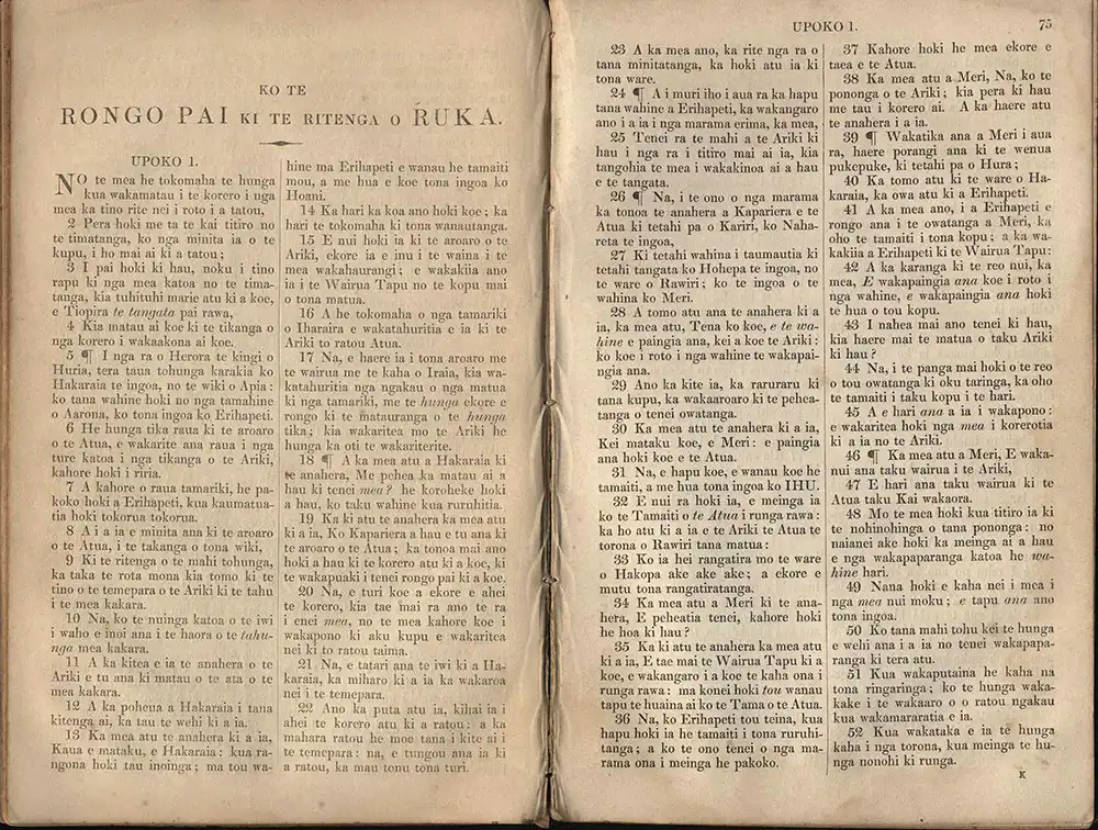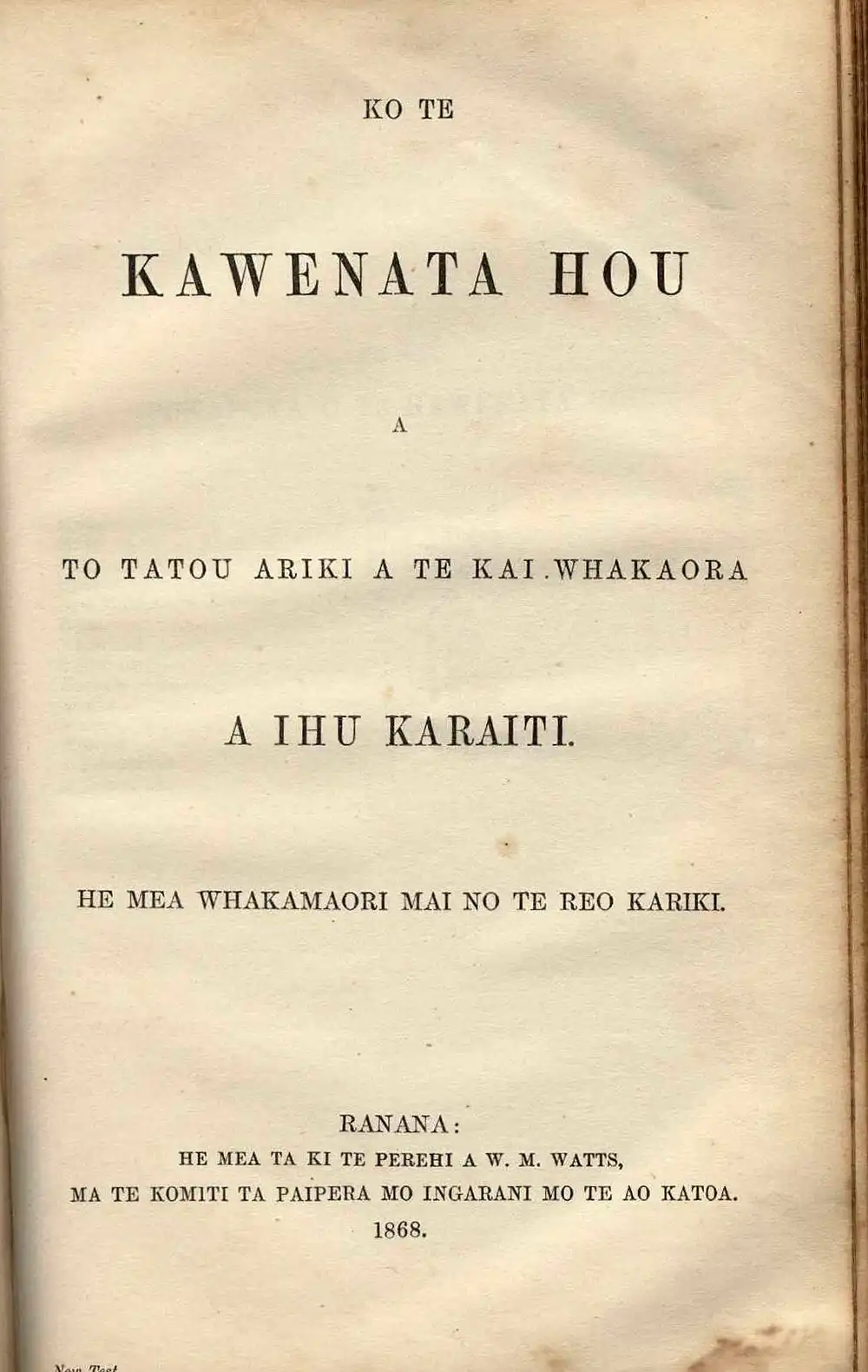 [New Testament in Māori]. Ko te Kawenata Hou o to tatou Ariki te Kai Wakaora a Ihu Karaiti: he mea wakamaori i te reo Kariki. Paihia [N.Z.]: He mea ta i te Perehi o nga Mihanere o te Hahi o Ingarani, 1837.