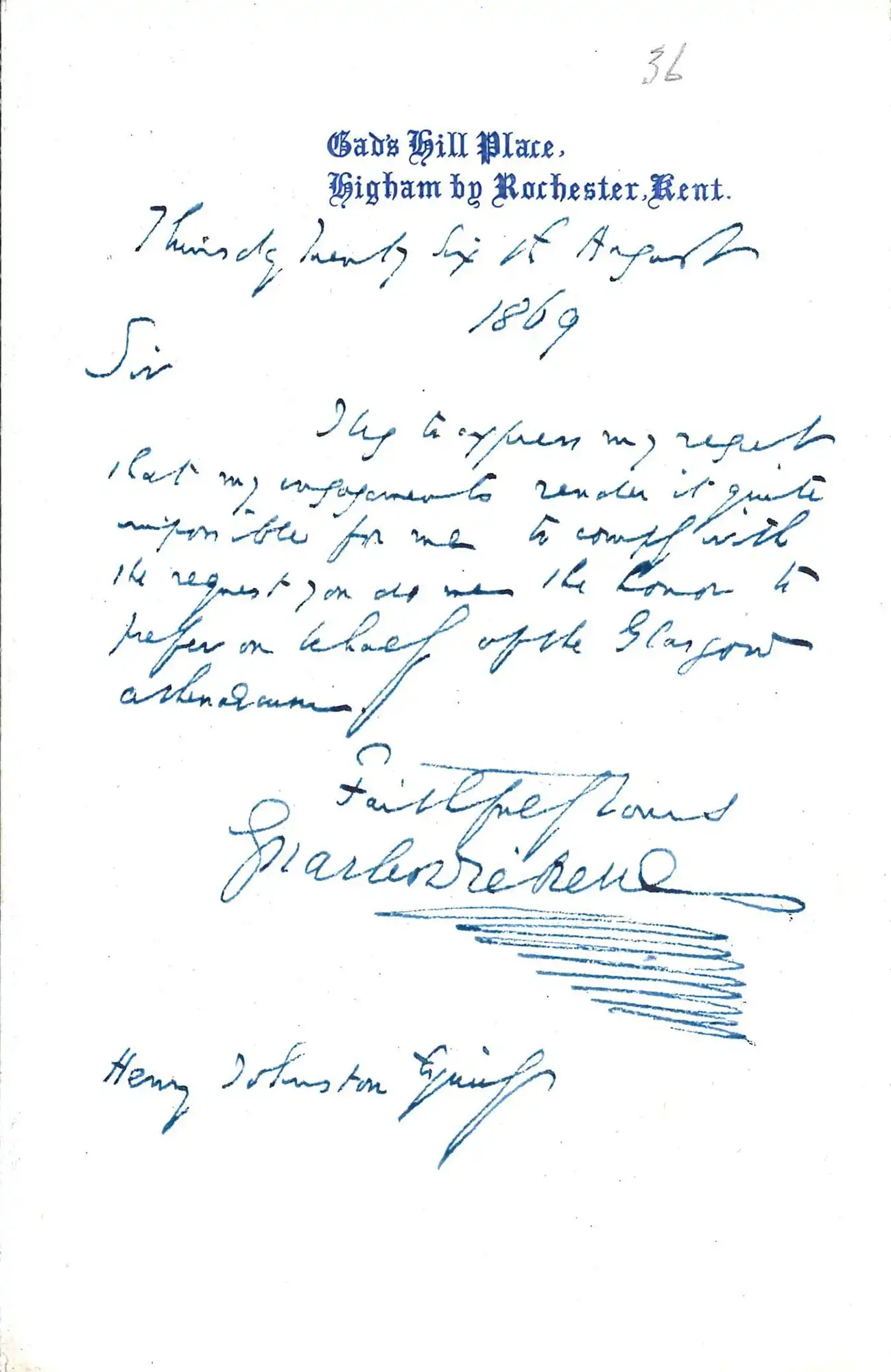 Letter, Charles Dickens to Henry Johnston, Gads Hill Place, Higham, Kent, 26 August 1869.