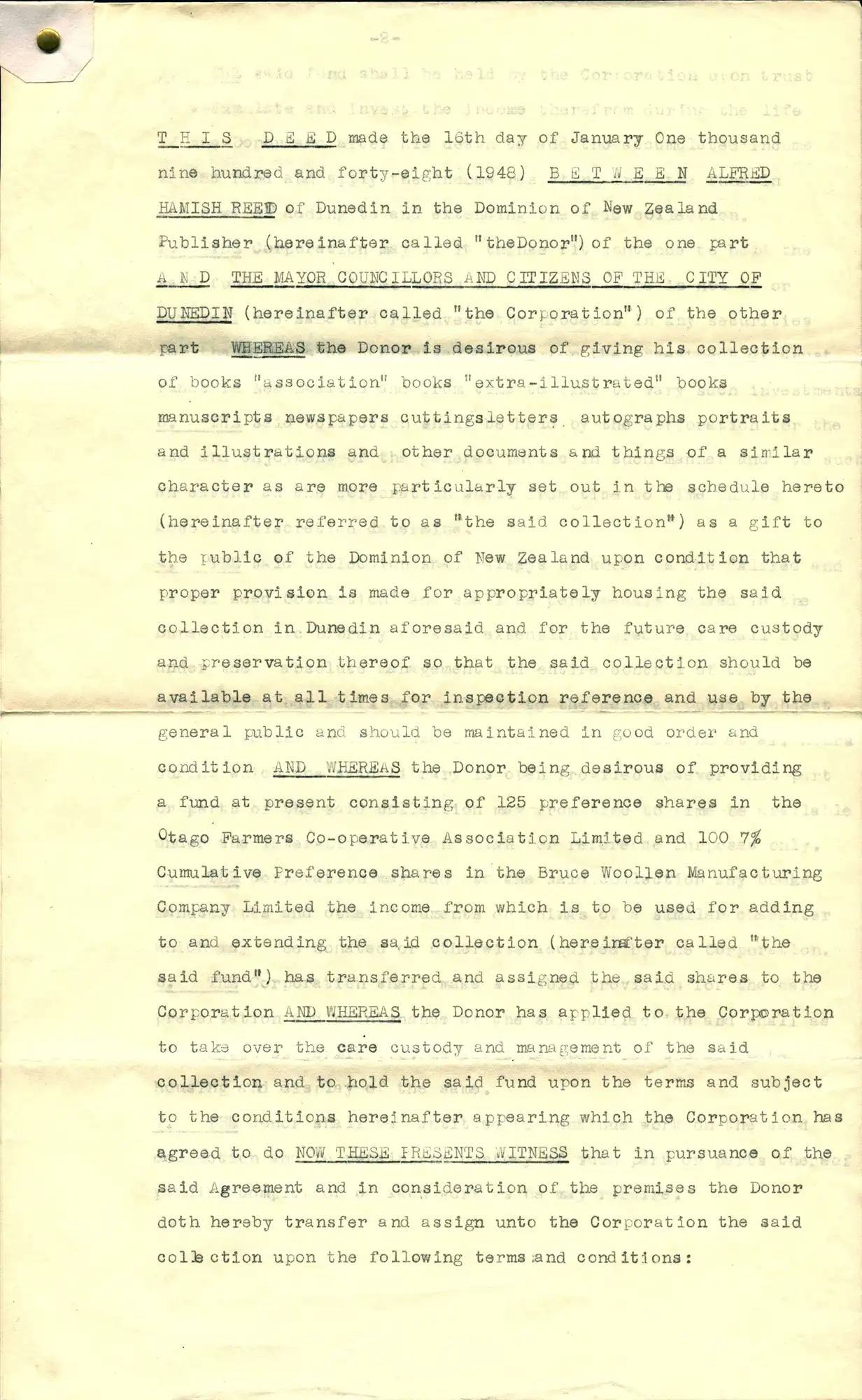 ‘Alfred Hamish Reed to the Mayor Councillors and Citizens of the City of Dunedin: Deed of Gift.’ 16 January 1948.