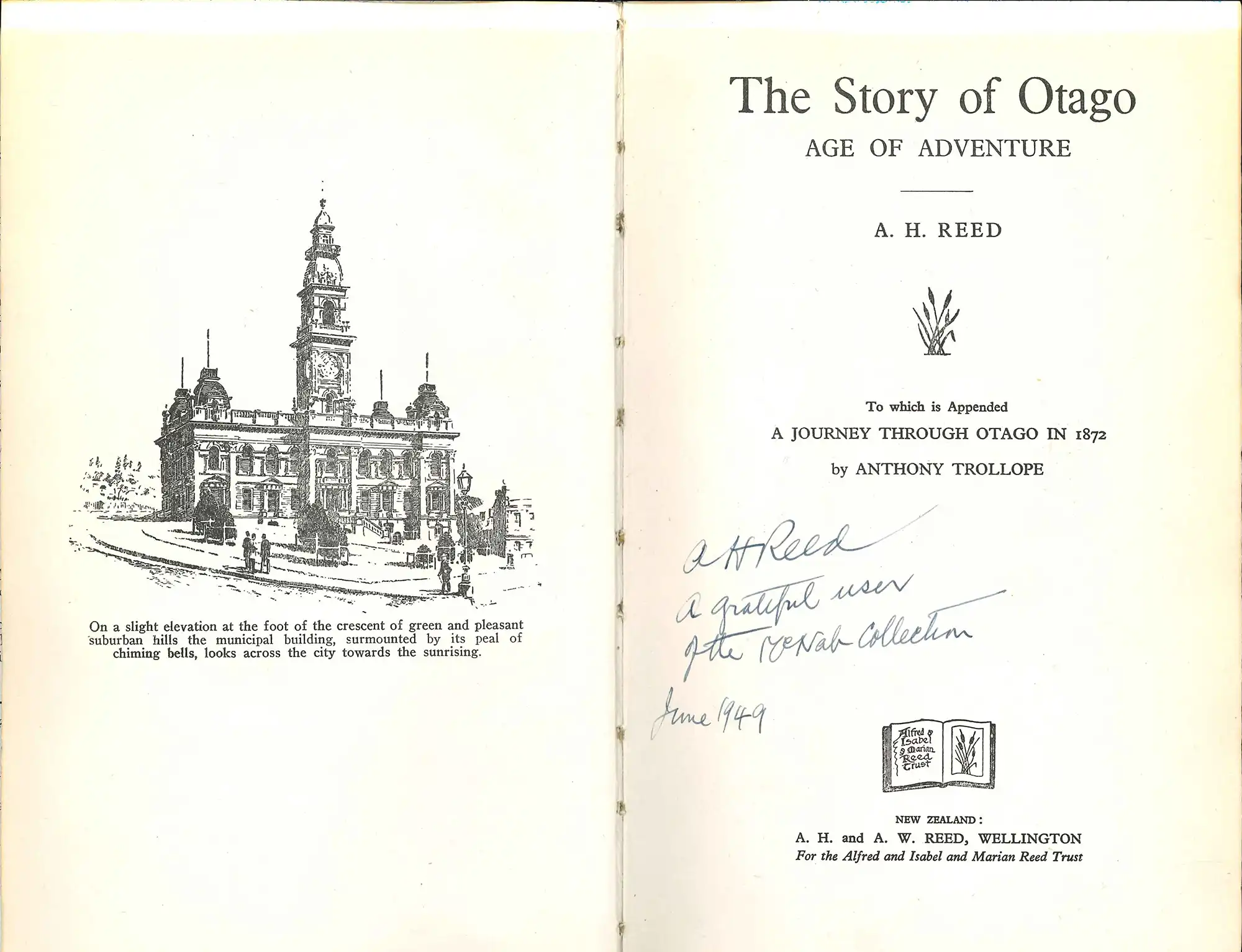 Reed followed The story of New Zealand with a history of his own province, Otago - his first of several regional histories. 1948 was to be Otago’s centenary year and the historian A.H. McLintock was appointed to write the official history of the province. Reed however saw the need for something to coincide with the March 1948 centenary celebrations and promptly produced The Story of Otago, which sold out before McLintock’s official history appeared in 1949.