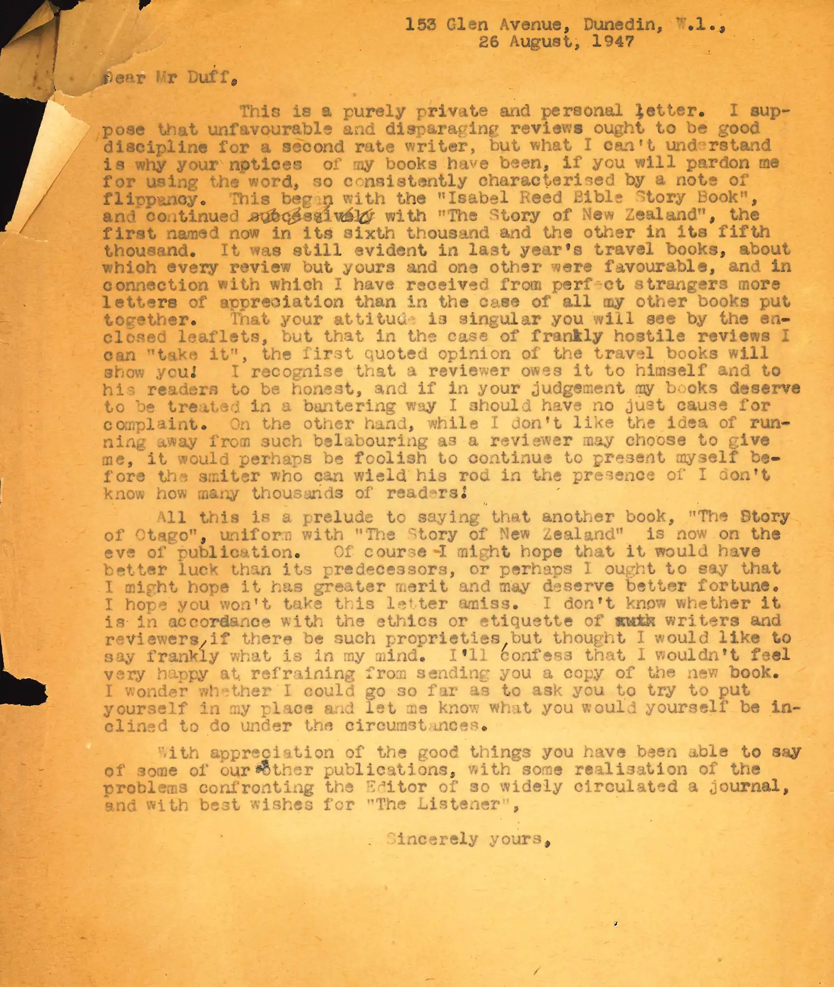 A.H. Reed’s popular approach to writing histories attracted strong criticism from certain quarters. One of his staunchest antagonists was the inaugural editor of the Listener, Oliver Duff (1883-1967). In the displayed letter, one of a series of testy exchanges between the pair, a clearly bewildered Reed is at a loss to understand Duff’s singularly unfavourable reviews when others are full of praise.