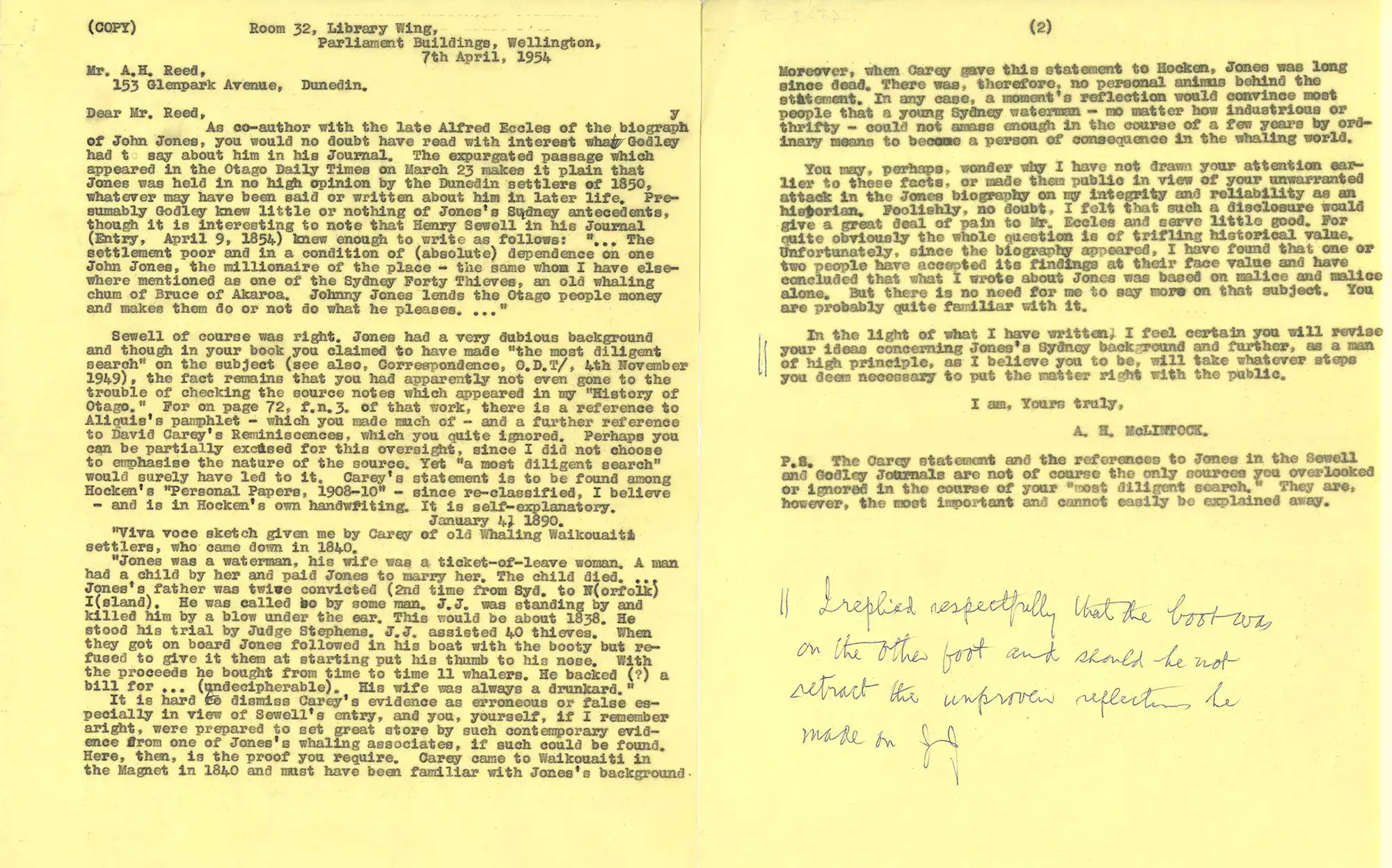 Reed and co-author Eccles (a descendant of Jones) were particularly unhappy with McLintock’s insinuation that Jones’ father was an Australian convict. After Eccles died in 1951, a series of testy exchanges by mail occurred between Reed and McLintock as to who had written the fairer account of Jones.