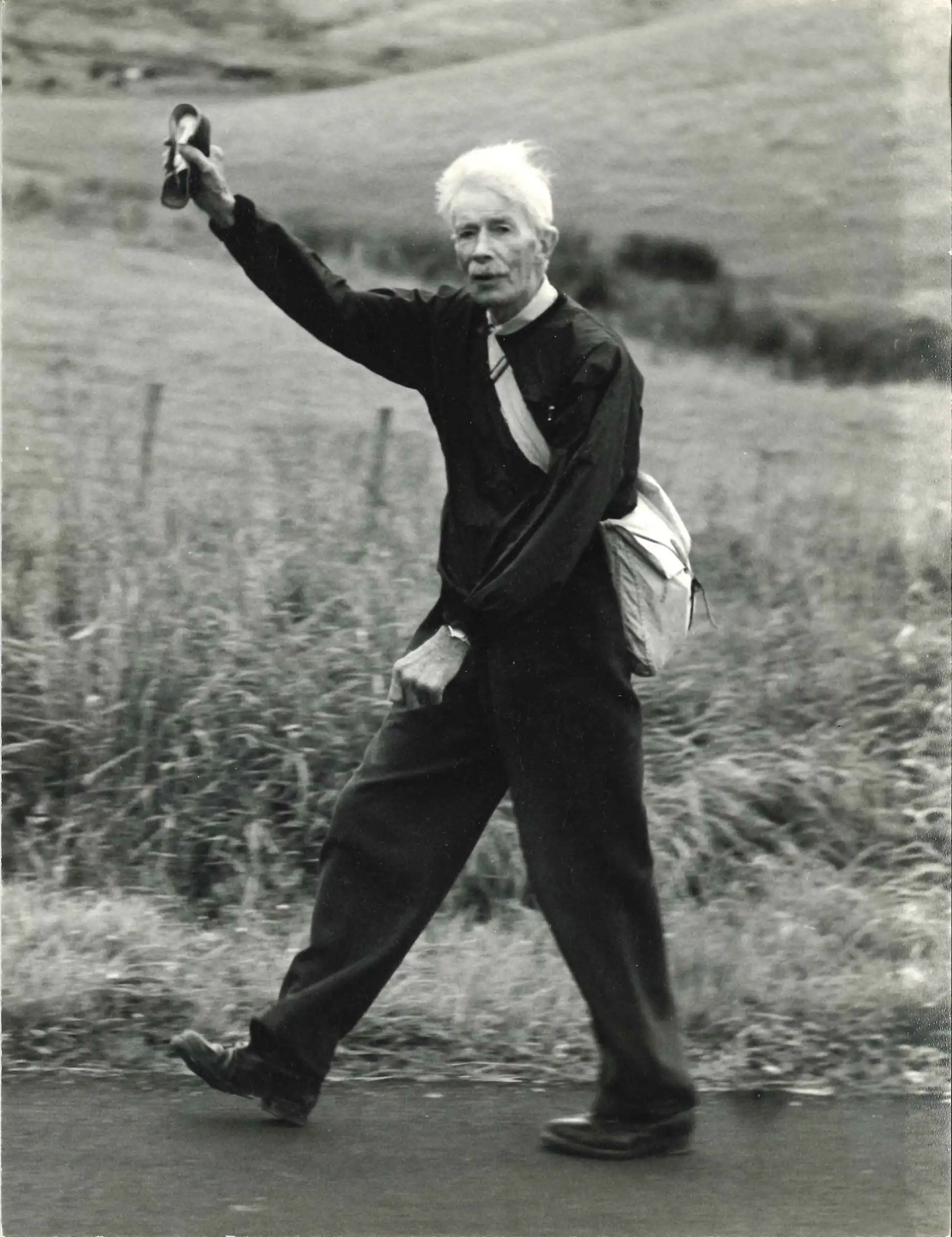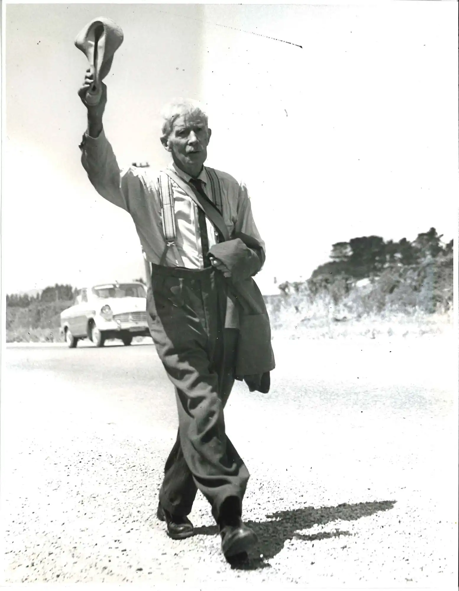 Photograph of A.H. Reed on final day of The friendly road walk, 1964. Photograph by Geoffrey Doust.