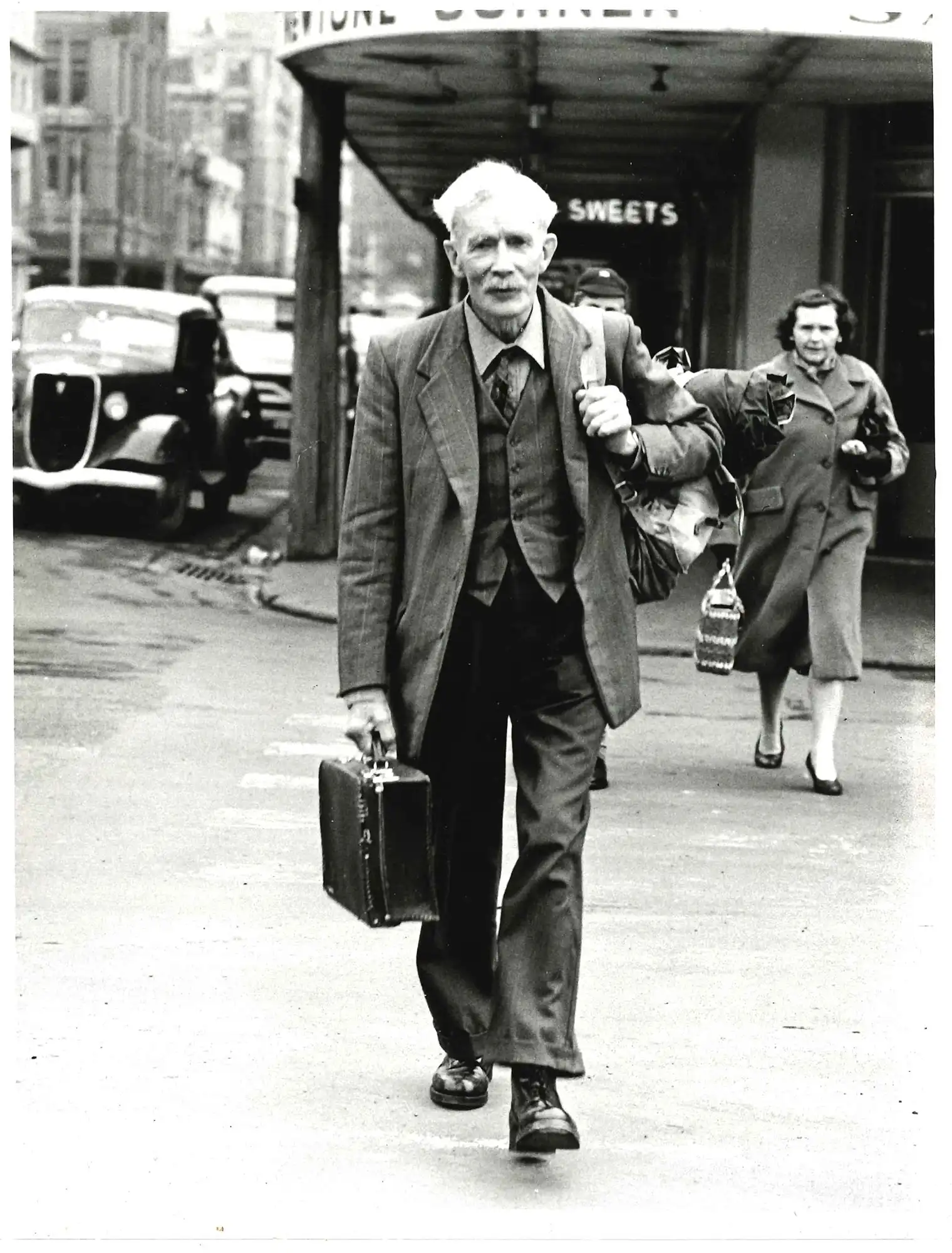 Photograph of A.H. Reed in town with suitcase, From North Cape to Bluff walk (Evening Star)