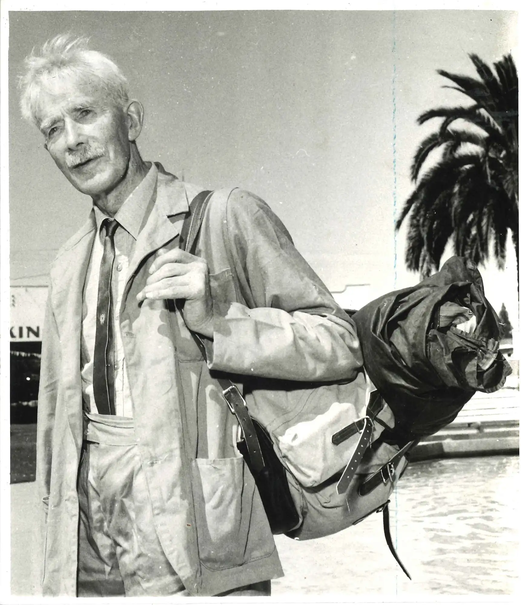 Photograph of A.H. Reed with backpack on Marlborough journey walk (Marlborough Express)