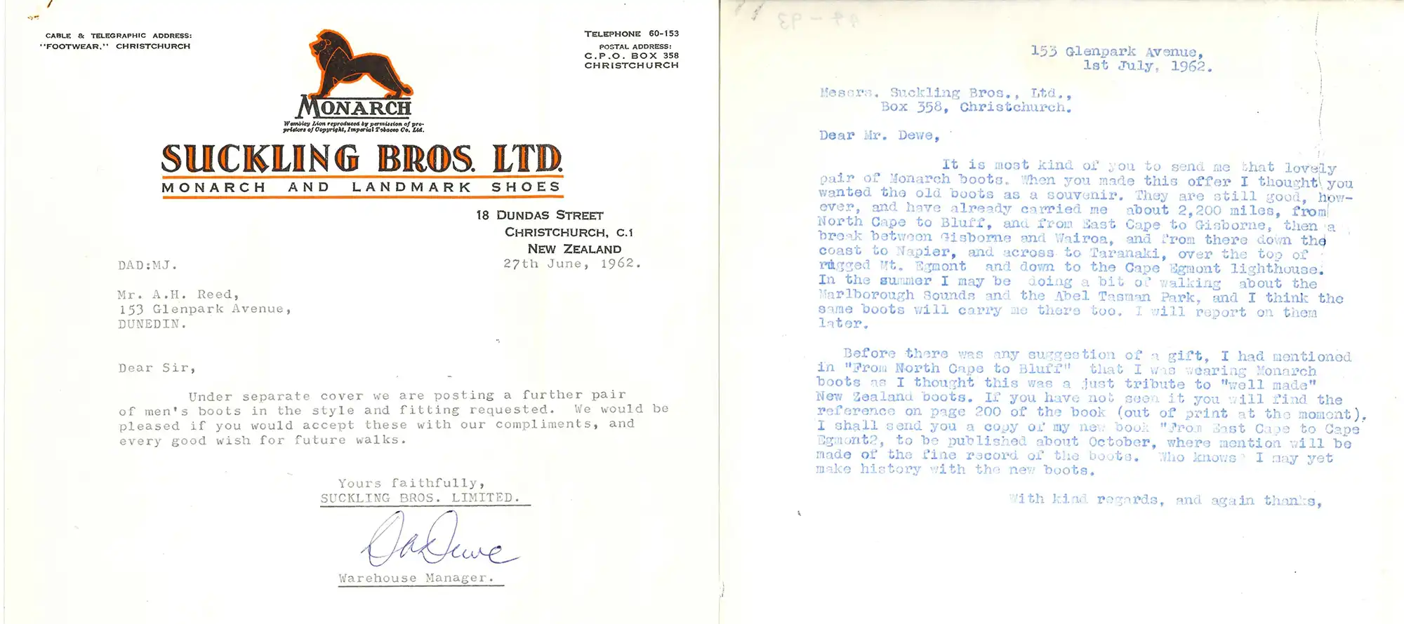 Letter, Suckling Brothers, Christchurch to A.H. Reed, Dunedin, 27 June 1962 re: Monarch boots. Reed’s reply of 1 July 1962.