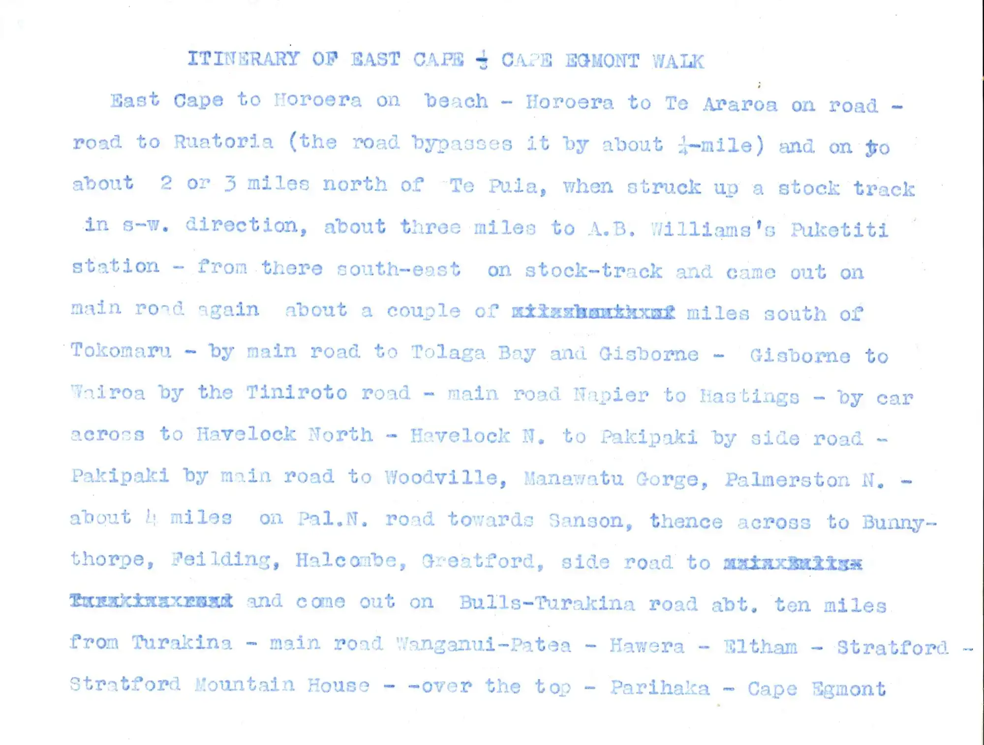 Having walked north to south from Cape Rēinga to Bluff at 85, Reed thought it a fun idea to traverse the country from east to west in the following year. On display is Reed’s own typed, loose itinerary, in which “over the top” refers to the crossing over Mt. Taranaki. He chose what appeared to be the widest part of the North Island and the story of his journey is told in From East Cape to Cape Egmont (1962).