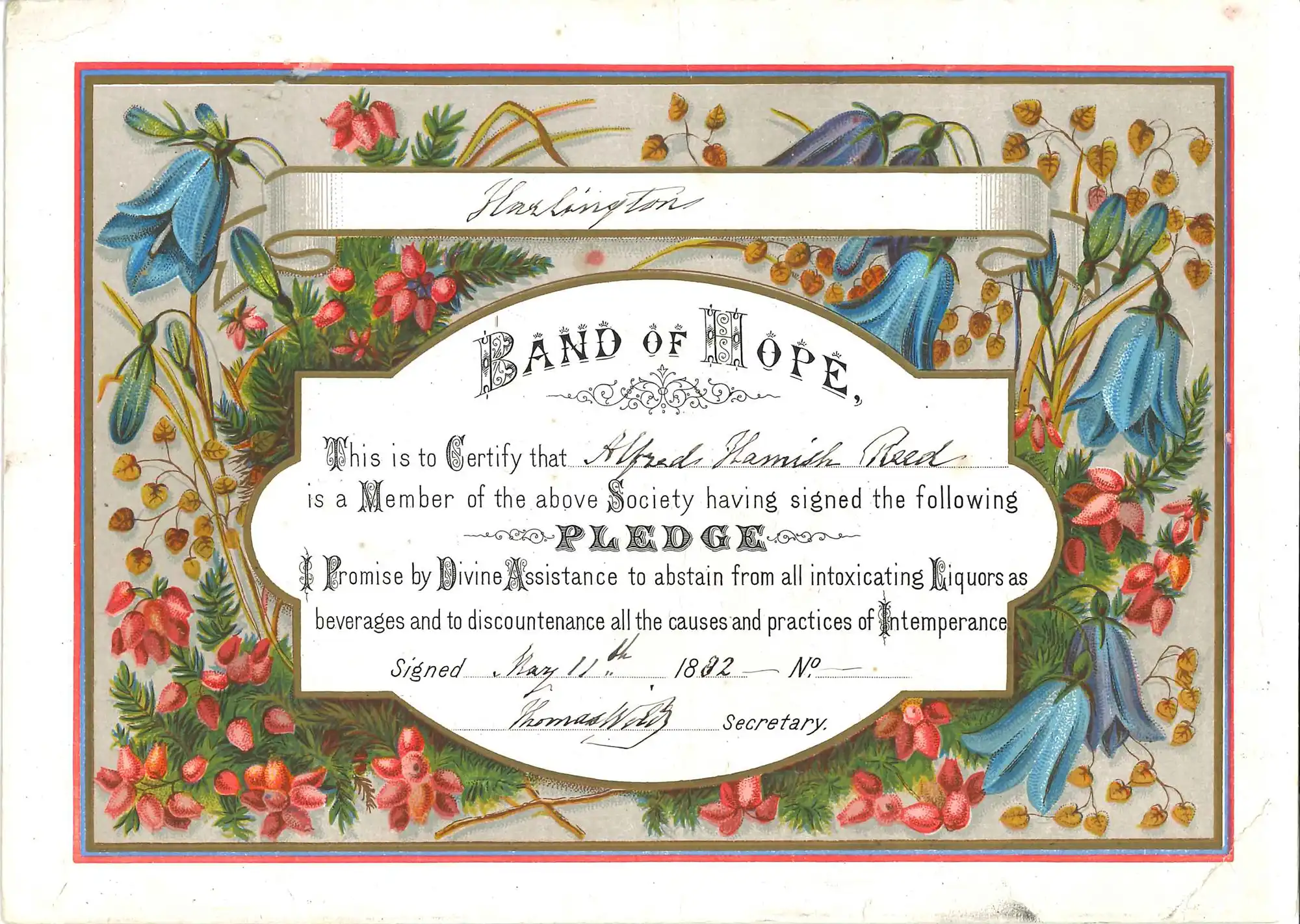 Alfred Reed’s Band of Hope, a childhood pledge to abstain from alcohol, which he would keep for nearly 90 years. Dated 11 May 1882.
