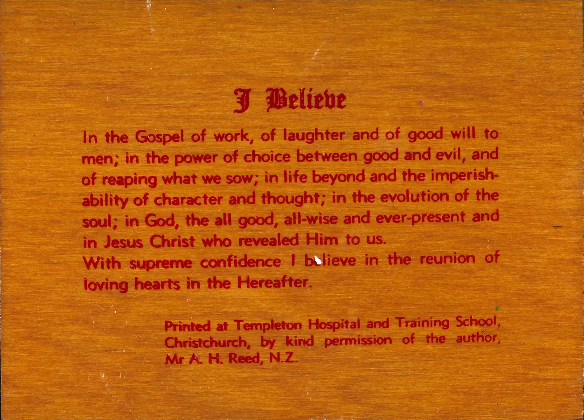A.H. Reed’s creed on a wall plaque of varnished wood, 1960s.
