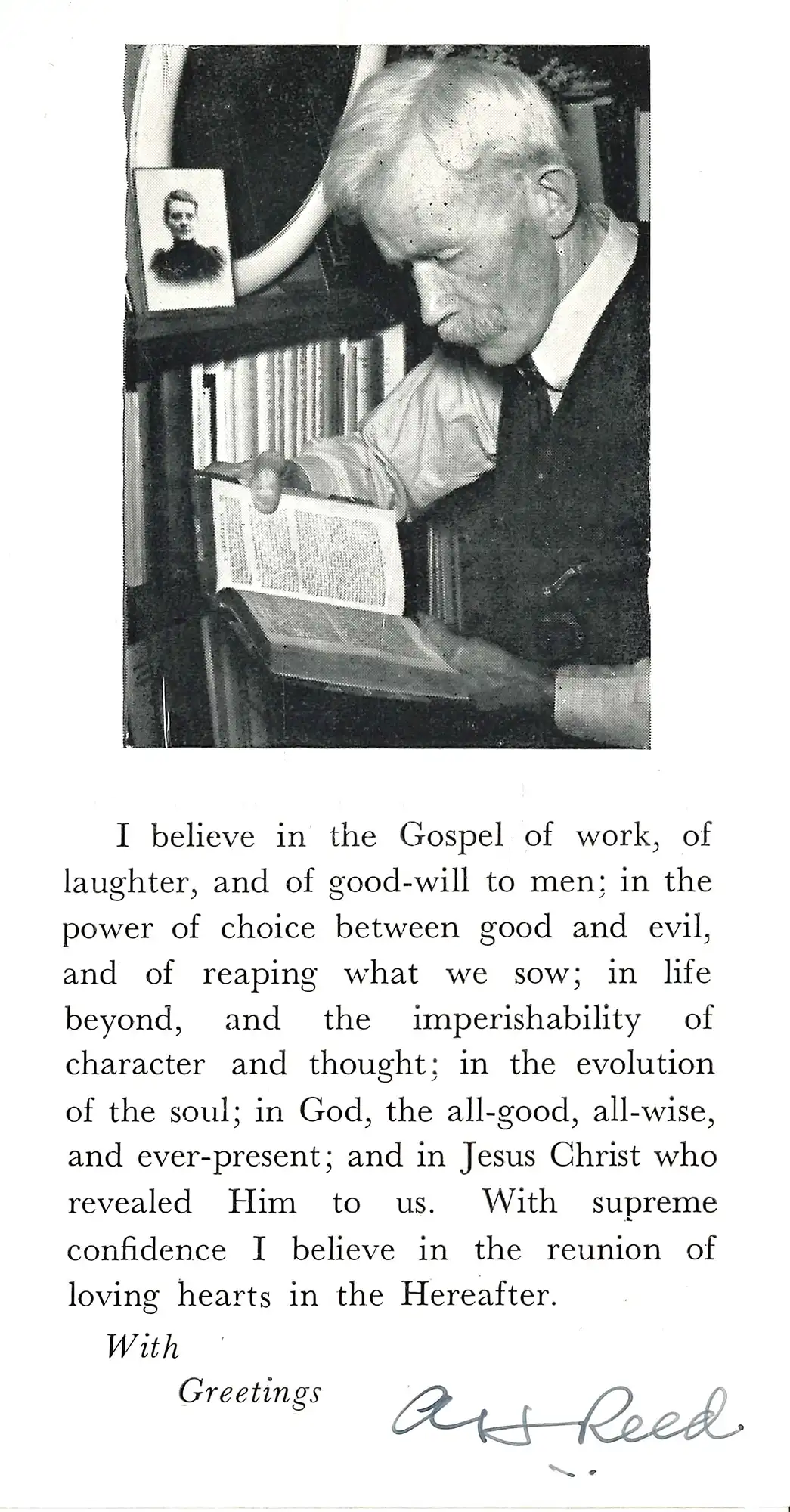 Reed included his personal creed on various printed cards which he often utilised in correspondence with friends and well-wishers until his final days.