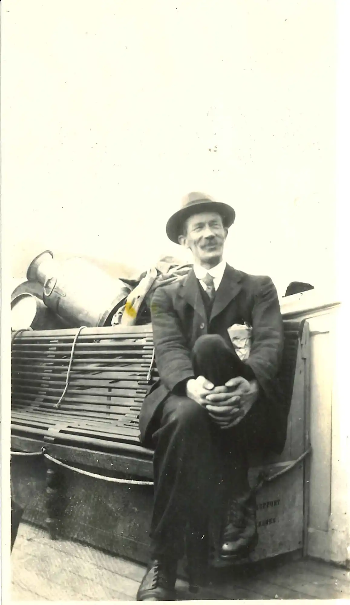 Photograph of Superintendent A.H. Reed on a Sunday School trip on a steamer in Otago Harbour, ca. 1920.