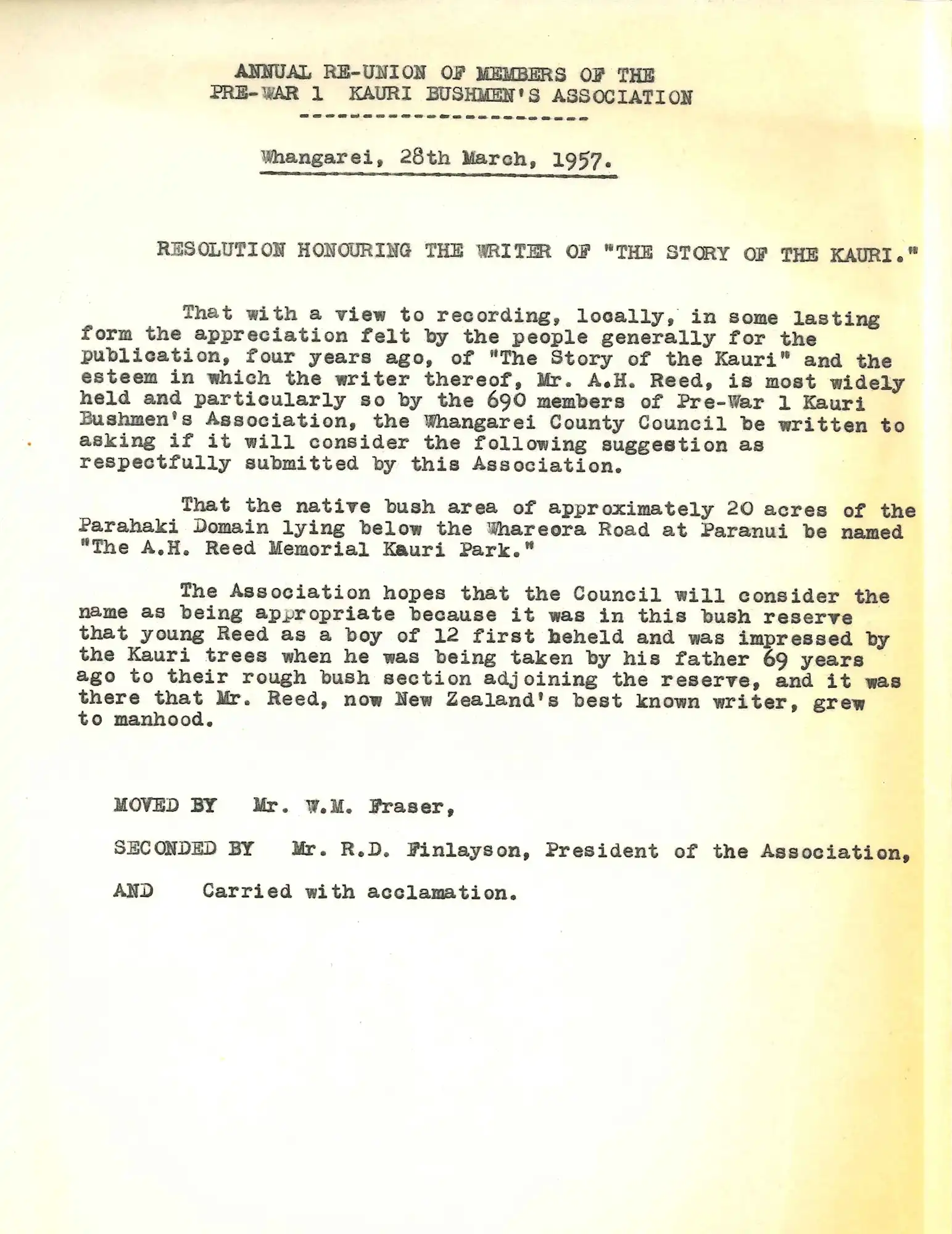 In 1957, W.M. Fraser of the Pre-War I Kauri Bushmen’s Association informed Reed that, as a tribute to The story of the kauri, he intended to suggest that a scenic reserve adjoining the old Reed homestead at Parahaki, be named the A.H. Reed Memorial Kauri Park.