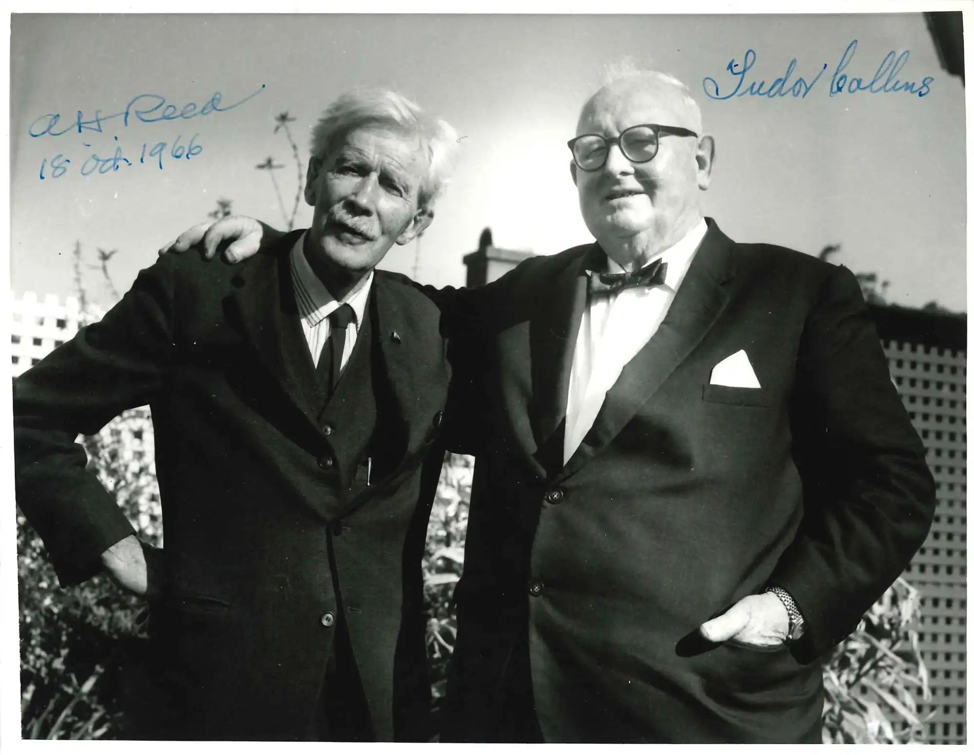 Photograph of A.H. Reed and Tudor Collins, signed by both, 1966.