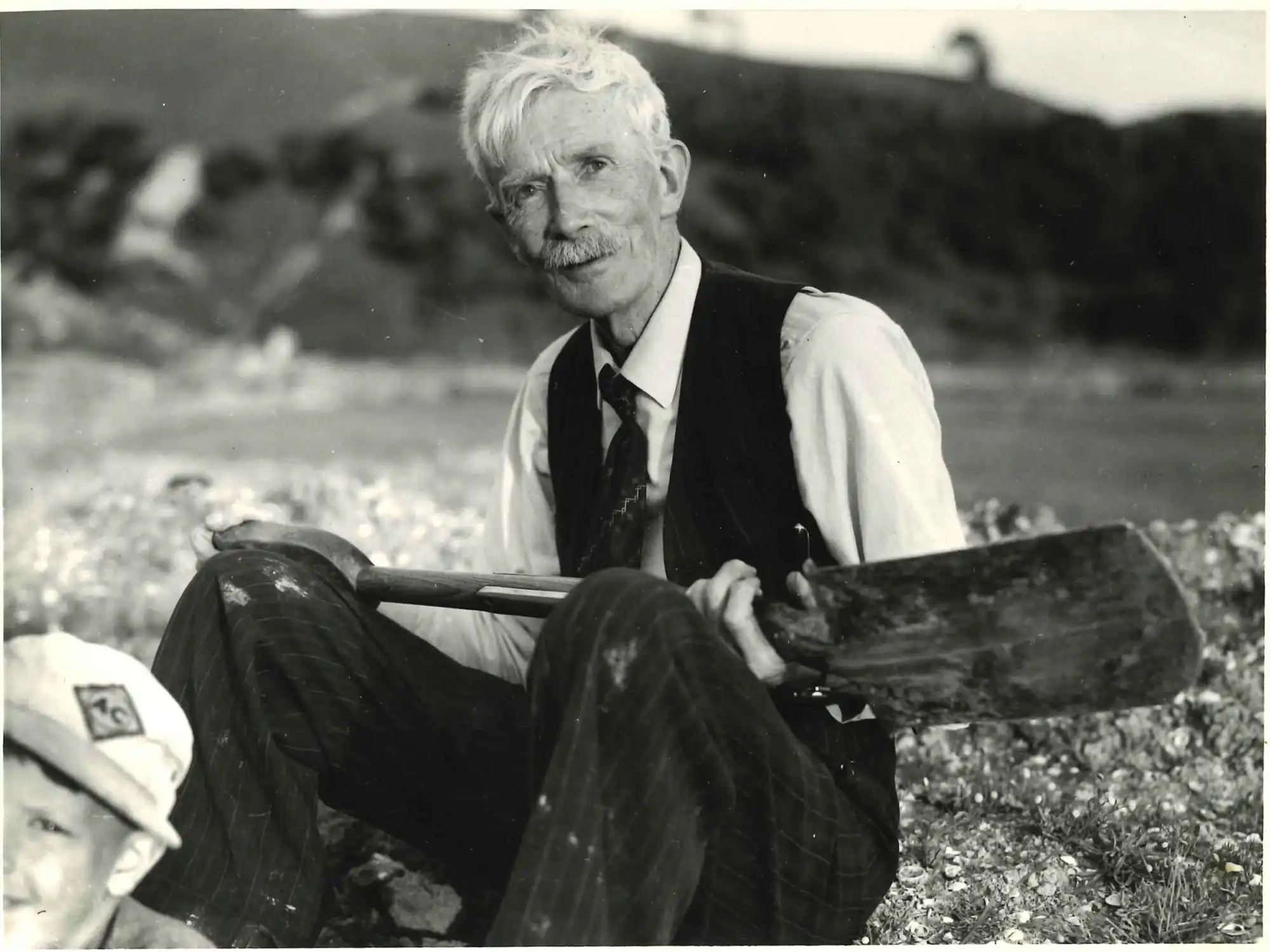 Photograph of A.H. Reed with a spade at kauri park, 1960s. Photograph by Tudor Collins.