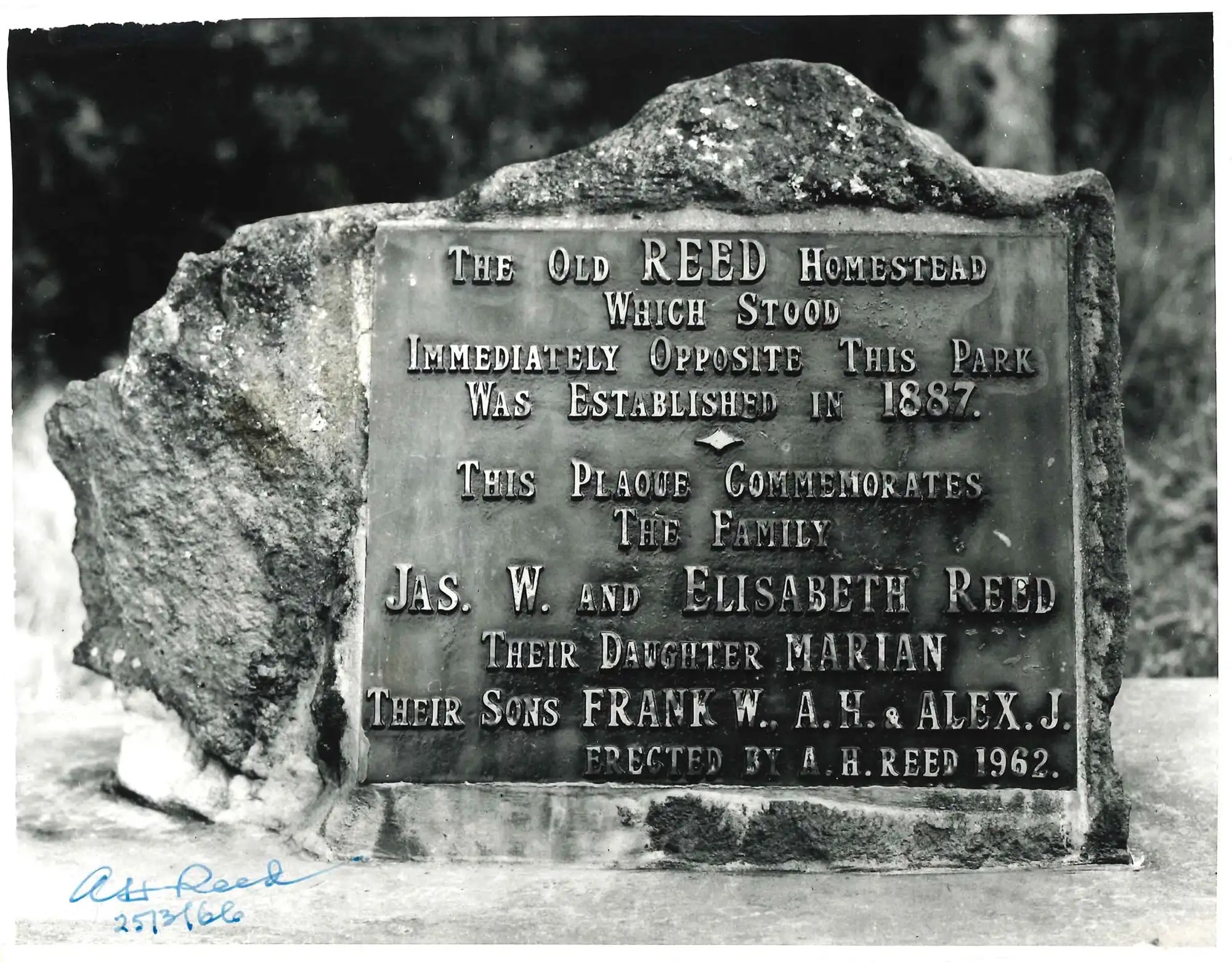 Photograph of plaque commemorating the old Reed homestead at Parahaki, Northland, 1966. Photograph by Tudor Collins.