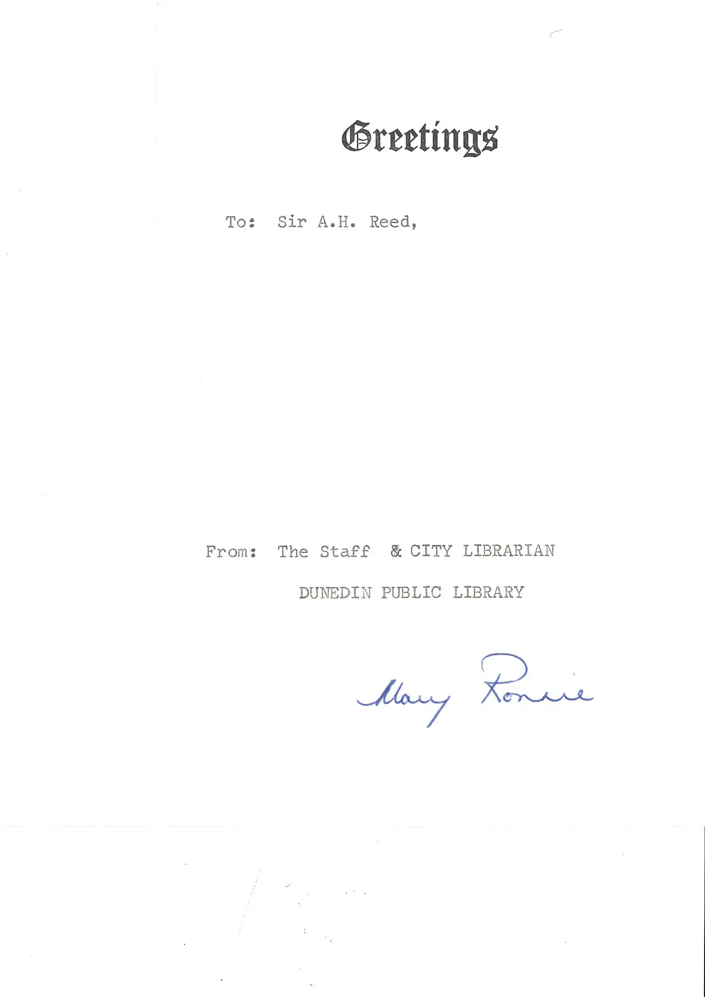 Greetings card, Mary Ronnie, Dunedin Public Library, to A.H. Reed, Dunedin, 27 November 1974.