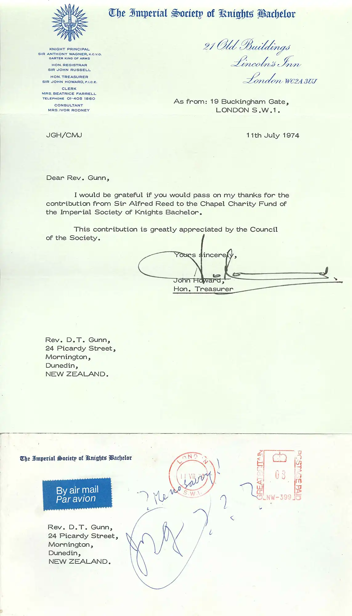 Letter, Imperial Society of Knights Bachelor, London to Rev. Jim T. Gunn, Dunedin, 11 July 1974; envelope with Reed’s scrawled response.