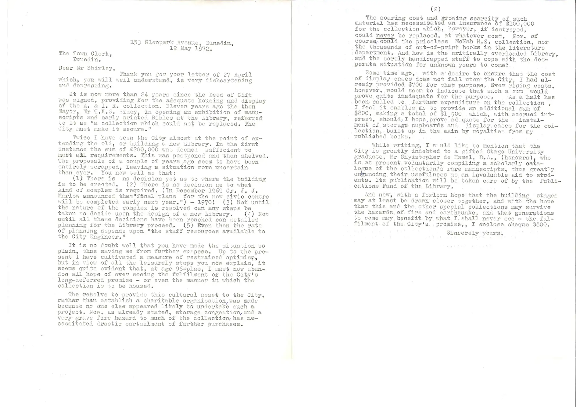 Letter, A.H. Reed, Dunedin to D.M. Shirley, Town Clerk, 12 May 1972.
