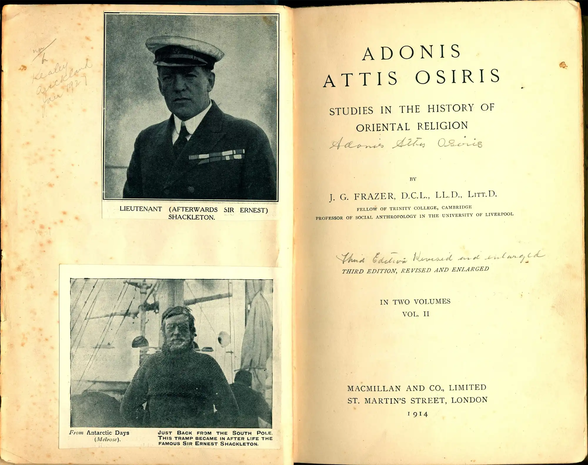 Another early one-off gift from Reed, donated in February 1935, was a single volume of Adonis, Attis, Osiris from the library of Shackleton’s 1914 Antarctic Expedition.