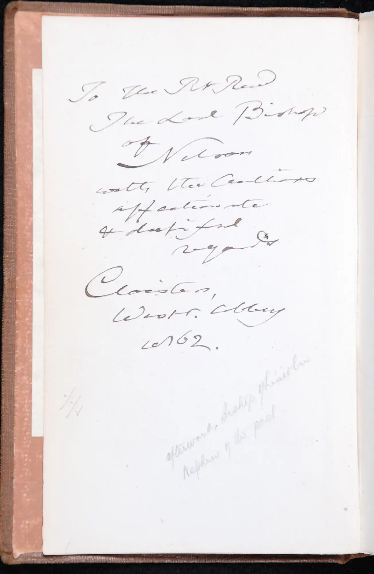 With presentation inscription to the Bishop of Nelson by the author Christopher Wordsworth (1807-1885), English Bishop, biblical scholar, hymn writer, and nephew of William Wordsworth.
