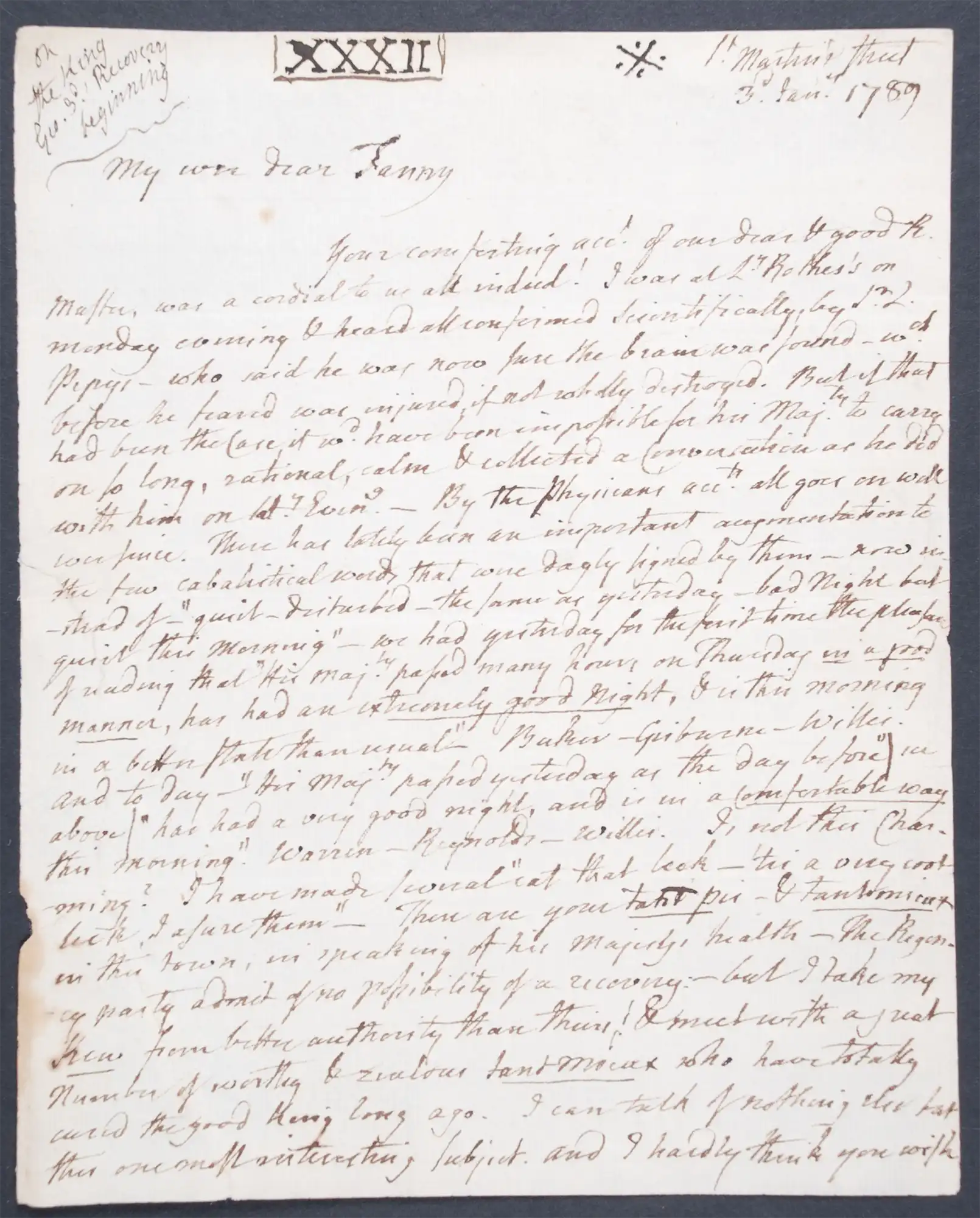 Frances Burney was then “Second Keeper of the Robes” in the court of George III during a period when the King was ill. This letter is an engaging account of Mr Burney’s response to the news of the King’s recovery, opening with: “Your comforting acct. of our dear and good R[oyal] Master was a cordial to us all indeed!”