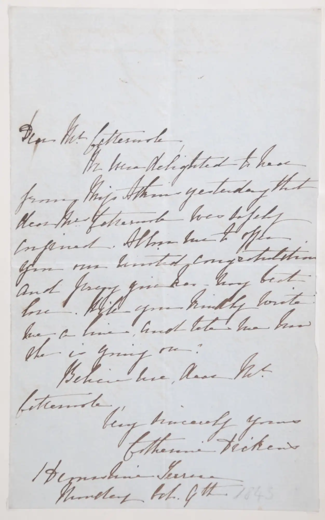 A letter dated 9 October is from Catherine Dickens (1815-1879), wife of Charles Dickens and mother to his ten children, to Clarissa Hester Cattermole (1812-1892), wife of Dickens’ friend the painter and illustrator George Cattermole (1800-1868). The letter would have been written between December 1839, when the family moved into Devonshire Terrace, and November 1851, when they removed to Tavistock House.