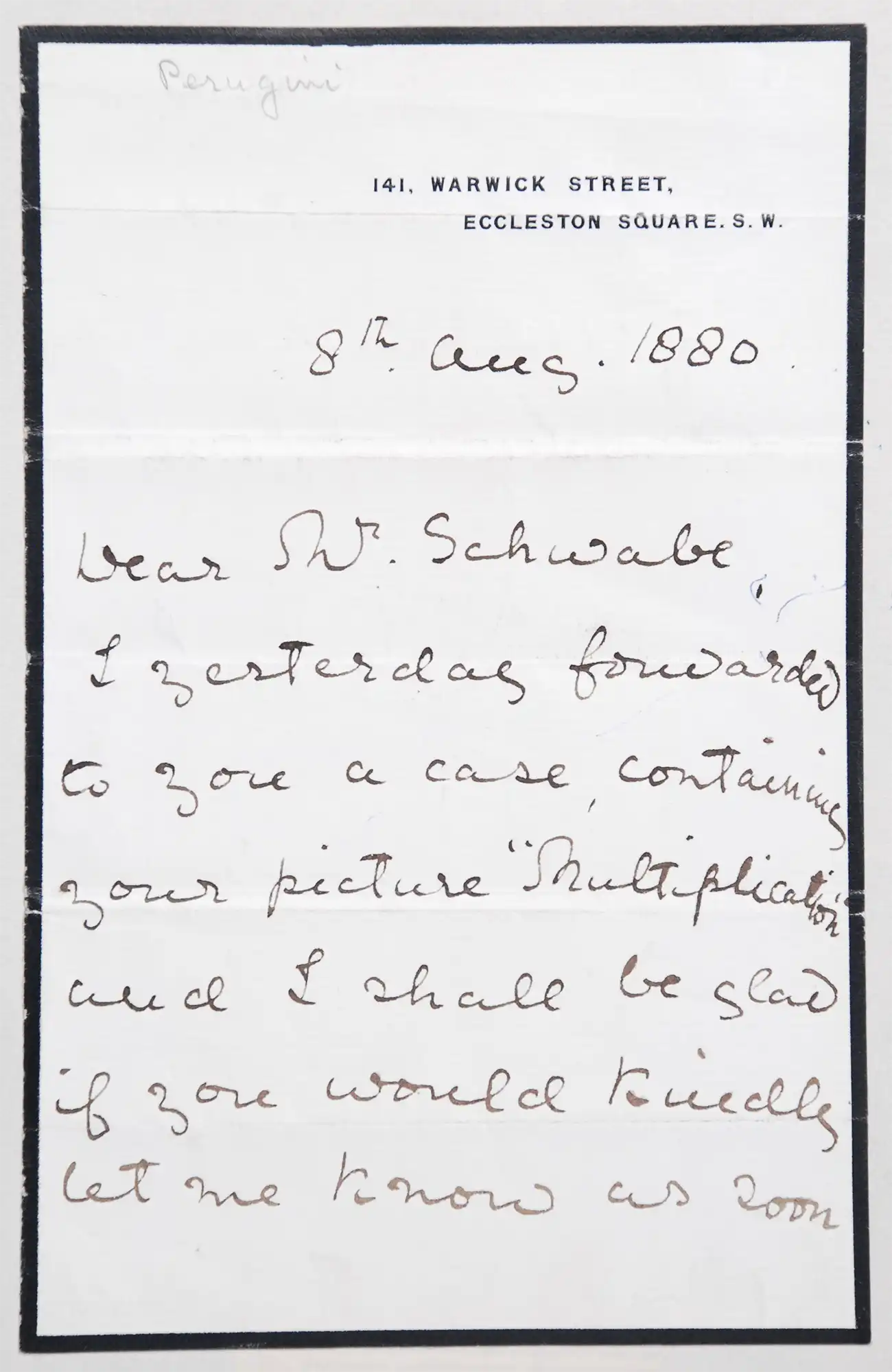 A letter dated 8 August 1880 is from Kate Perugini (1839-1929), Charles Dickens’ daughter and a painter best known for her portraits of children. It is one of three concise letters by Perugini purchased by Reed from a London dealer in 1927.