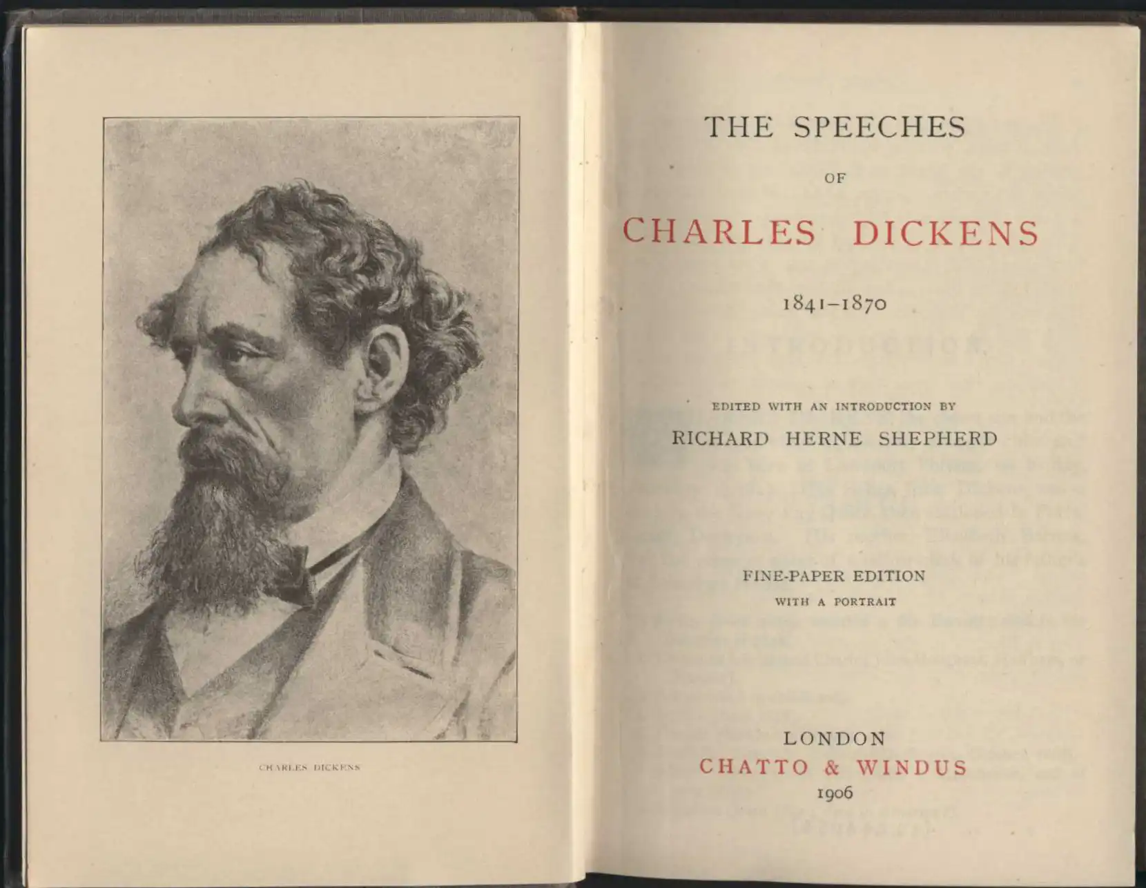 Richard Herne Shepherd (editor). The speeches of Charles Dickens, 1841-1870. Fine paper edition. London: Chatto & Windus, 1906.