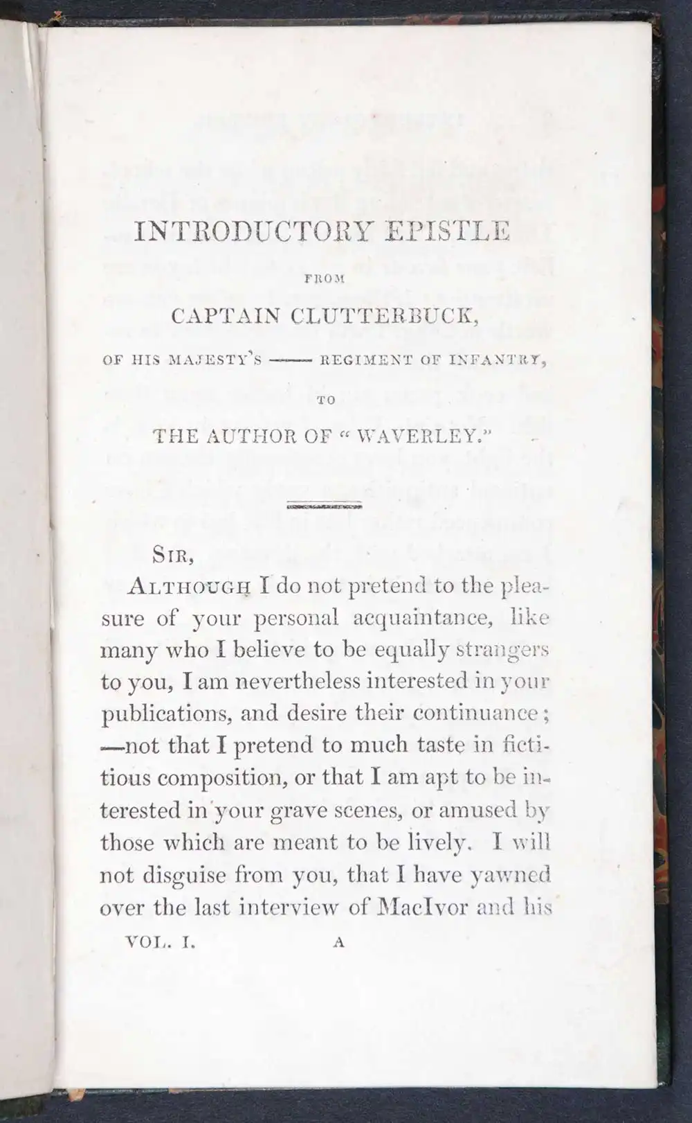 The monastery is preceded by an introductory epistle by ‘Captain Clutterbuck’, a military veteran turned antiquarian, who relates how he has discovered a Benedictine manuscript relating the history of the fictional Abbey of Kennaquhair, and requests the ‘author of Waverley’ to edit it for publication.