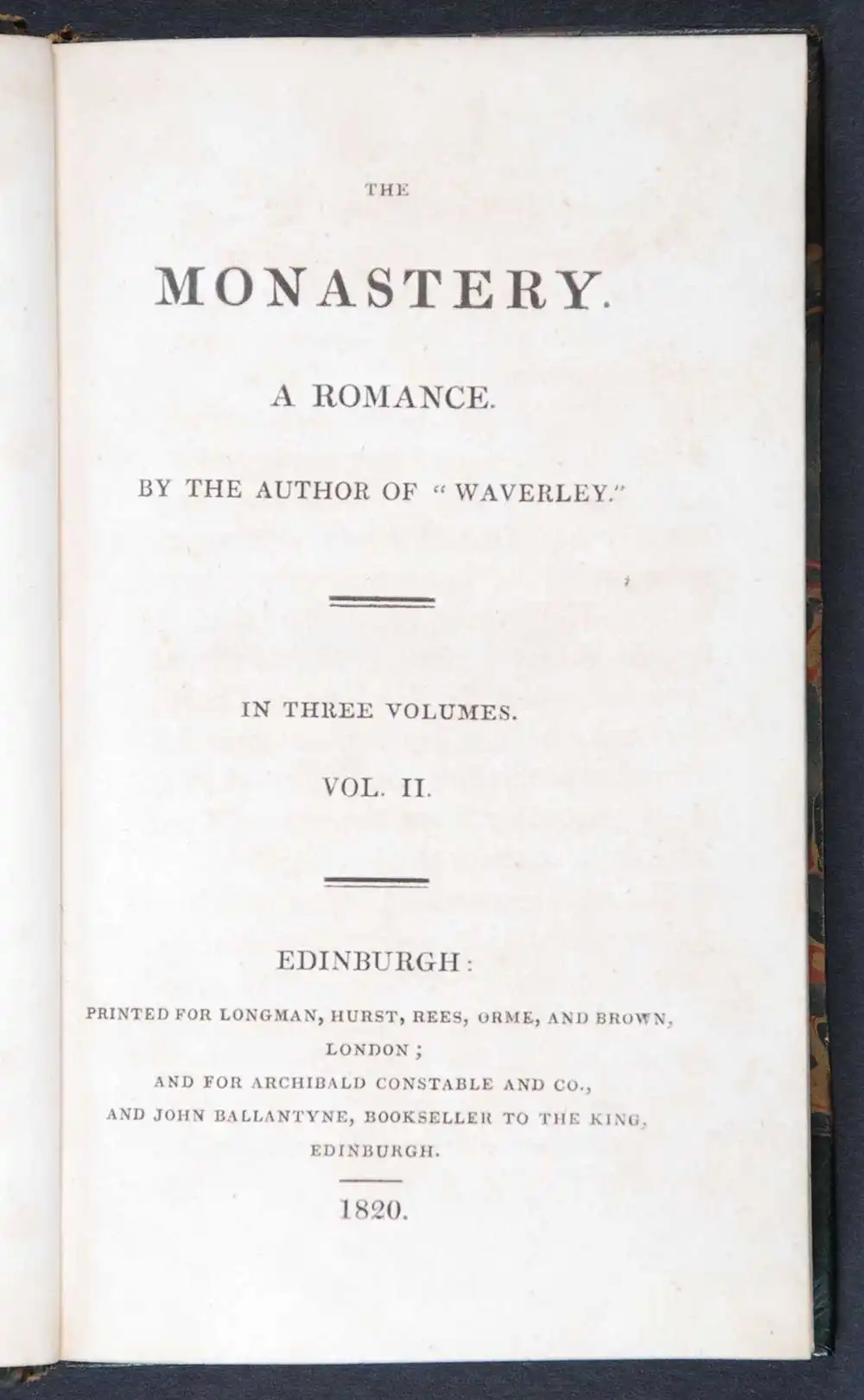[Sir Walter Scott]. <em>The monastery: a romance.</em> [1st edition]. Edinburgh: Printed for Longman, Hurst, Rees, Orme and Brown, London; and for Archibald Constable and Company, and John Ballantyne, Edinburgh, 1820. Three volumes; Vol. 2 displayed.