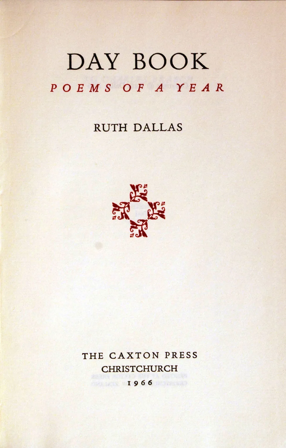Ruth Dallas. Day Book: Poems of a Year. Christchurch: The Caxton Press, 1966. Ruth Dallas. Day Book: Poems of a Year. Christchurch: The Caxton Press, 1966. Open image in new window
