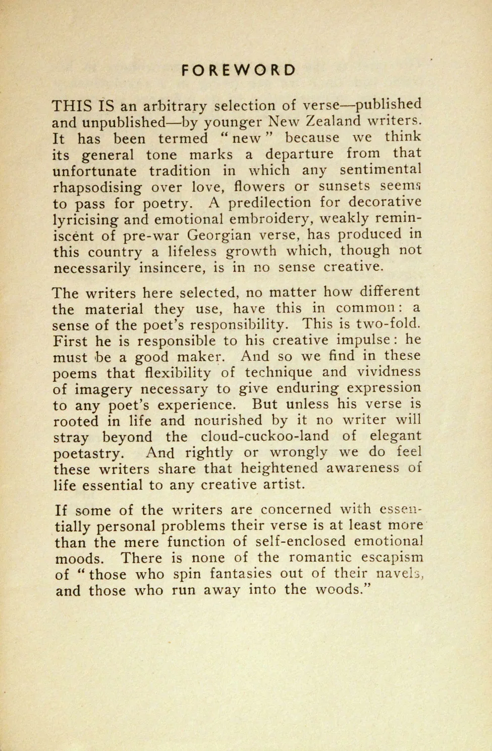 Milner’s anti-Georgian introduction argued for New Zealand’s poetry to include ‘a freshening of imagery’, and called on the poet to be ‘the focal point of awareness in his time’, combining the ‘willingness to face unpleasant issues [with an] implied faith in a more creative way of living’. According to the historian and critic Lawrence Jones, New Poems is ‘singularly impressive, the best statement to date of the new literary movement, [and] far superior to Phoenix’ from a literary standpoint (40–41).