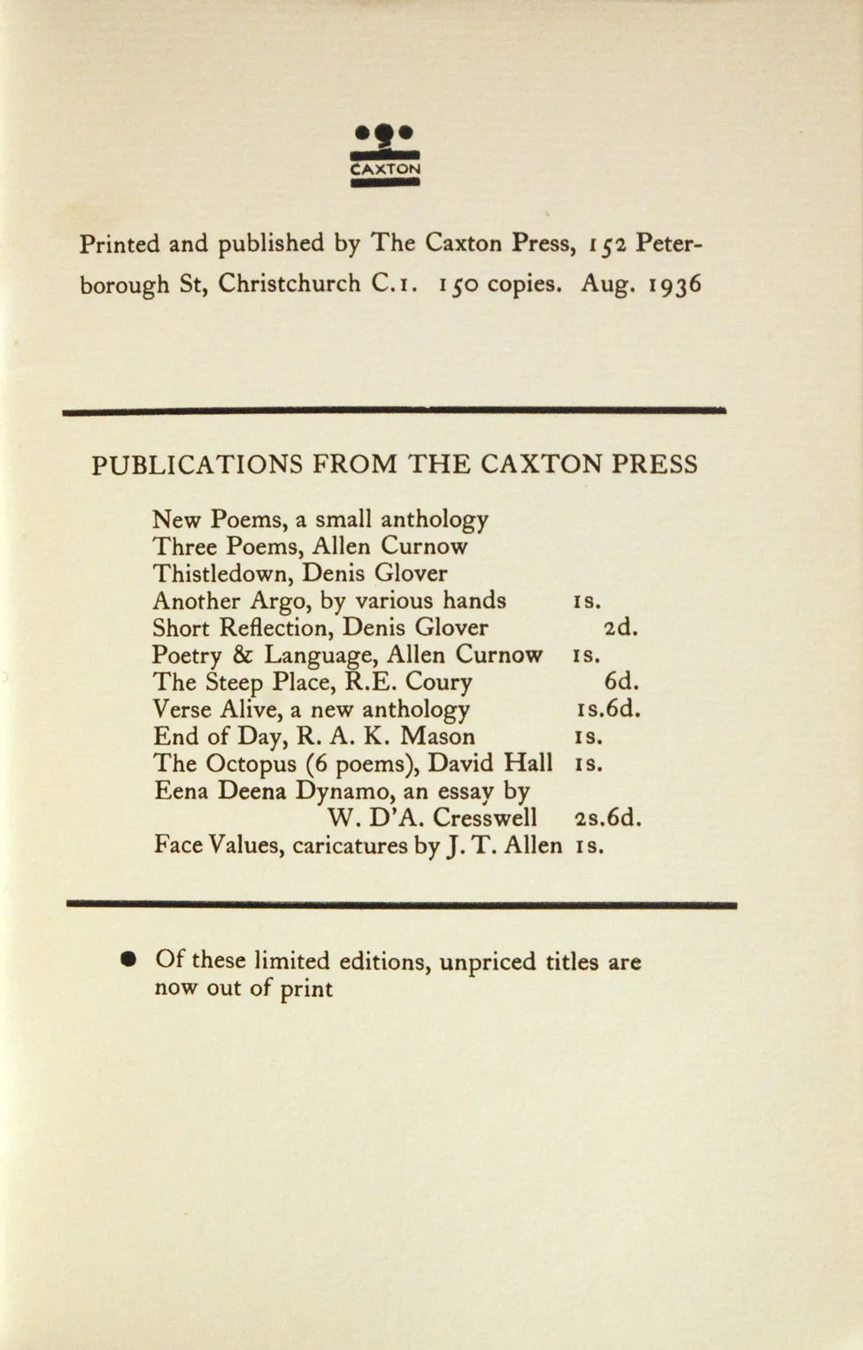 Denis Glover. Six Easy Ways of Dodging Debt Collectors [or] Several Poems… Christchurch: The Caxton Press, 1936.