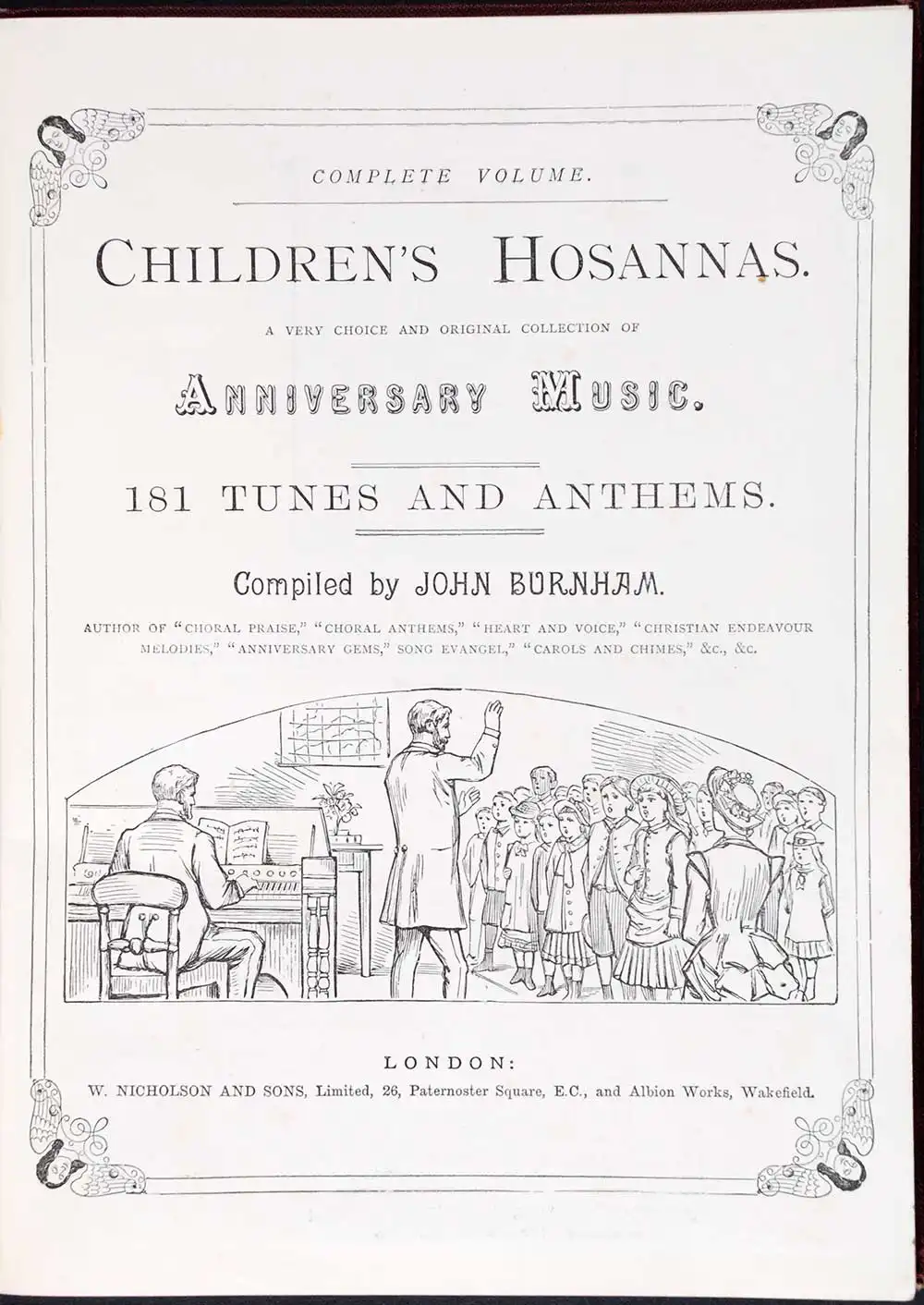 John Burnham (editor). Children's hosannas: a very choice and original collection of anniversary music. London: W. Nicholson, [1889?]