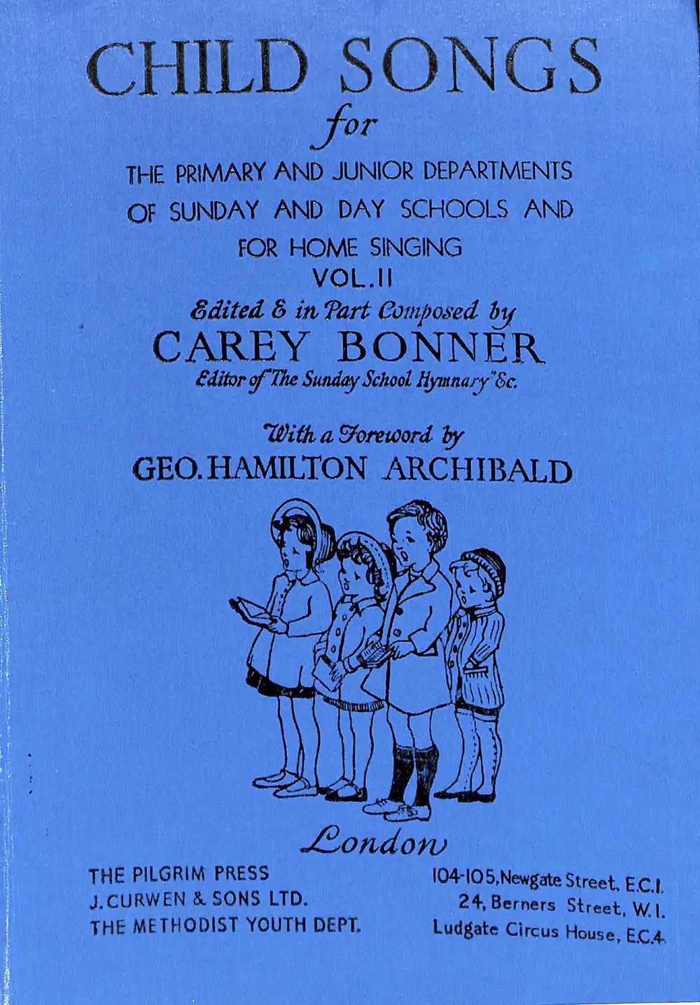 Carey Bonner (editor). Child songs: for the primary and junior departments of the Sunday school and day school and for home singing. Volume II. London: Pilgrim Press, 1914.