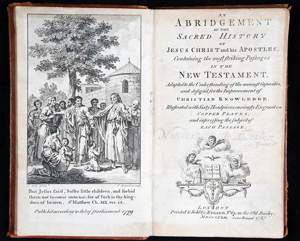 An abridgement of the sacred history of Jesus Christ and his Apostles: containing the most striking passages in the New Testament: adapted to the understanding of the meanest capacities, and design'd for the improvement of Christian knowledge. London: Printed & sold by Ryland, 1779.